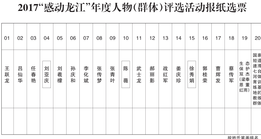 为深入贯彻落实党的十九大精神,弘扬核心价值观、传承龙江优秀精神,广泛宣传推动龙江全面振兴发展伟大实践中涌现出的自强不息、敬业乐群、扶正扬善、扶危济困、见义勇为、孝老爱亲等先进典型,为奋力走出振兴发展新路子,建设富强民主文明和谐美丽社会主义现代化新龙江提供精神动力和榜样标杆。按照《2017“感动龙江”年度人物(群体)评选活动方案》安排,省委宣传部、省精神文明办、省总工会、团省委、省妇联、省报业集团、黑龙江广播电视台联合组织开展了2017“感动龙江”年度人物(群体)评选活动。表彰奖励2017年度发生在我省的,或者是黑龙江省籍人士做出的感人至深、影响强烈、传递社会正能量的个人和群体。现将各地、各系统推荐并经组委会审定的“感动龙江”年度人物(群体)候选名单及简要事迹向社会公示,请广大干部群众积极参与、踊跃投票,从中评选出10个您心目中的2017“感动龙江”年度人物(群体)。 一、投票时间 2017年12月29日开始至2018年1月9日结束。 二、投票平台 1、《黑龙江日报》刊印书面选票。 2、东北网设置网络投票平台。 3、开设手机短信息投票平台。 三、投票方法 1、报纸选票。2017年12月29日,《黑龙江日报》刊登2017“感动龙江”年度人物(群体)候选名单和选票,简要事迹详见东北网、黑龙江新闻网。请在每个系列的20个候选人物(群体)中选出10个,多于或少于10个为无效票,请在选中人物(群体)名下划“√”。用钢笔或圆珠笔填写清楚,翻印和复印选票无效。投票截止日期为2018年1月9日(以邮戳为准)。选票请寄黑龙江省“感动龙江”年度人物(群体)评选活动组委会办公室(黑龙江省委宣传部宣传教育处)。地址:哈尔滨市南岗区花园街294号;邮编:150001;联系电话:(0451)53610293。 2、网上投票。2017年12月29日,东北网络台开设2017“感动龙江”年度人物(群体)评选活动宣传专栏,打开该专栏之后,按程序点击投票。请在每个系列候选人物(群体)中选出10名,多于或少于10名视为无效。每个身份证号限投一票,同一IP地址24小时内投一次。投票截止日期为2018年1月9日。东北网网址:htt p://www.dbw.cn;咨询电话:(0451)87116818,工作时间:周一至周五8:30-17:00。 3、手机短信息投票。2017年12月29日,开通手机短信投票平台。短信投票规则:您在所有候选人中选出10名,多于或少于10名无效。手机用户编辑短信“TPT加候选人编号”(编号不能重复,每个编号用“,”隔开,每位候选人编号均为两位数),移动、联通、电信用户发送到10628007。例如:您要为01号到10号候选人投票,则移动、联通、电信手机用户编辑短信“TPT01,02,03,04,05,06,07,08,09,10”发送10628007即可。 注:短信发送成功,每条收费1元。每个手机号码24小时之内投票不能超过10条(含10条)。短信投票时间为早6点到23点。投票期间投票手机号码不能处于停机状态。违反以上规则投票均全部无效。投票截止日期为2018年1月9日。 黑龙江省“感动龙江”年度人物(群体)评选活动组委会2017年12月29日