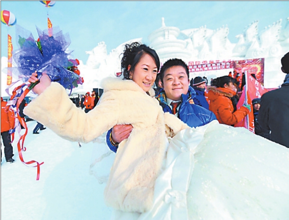 □王丽娟 每年1月份的冰城哈尔滨,在松花江北岸的雪博会上,都要举办冰上集体婚礼,这在北方民俗婚礼中是最有代表性的。婚庆典礼现场彩带绽放、礼炮齐鸣,一派热烈、吉祥喜庆,汇成了一幅幅动人的画面 婚礼进行曲的乐声响起,几十名花童手持红灯笼、身披红斗篷,引导着一对对新人挽手而来,走上红地毯。红色的玫瑰花在他们手中盛放,空中撒下丝带花雨,如缠绵悱恻的爱恋,演绎人间最美的真情。 新娘洁白的婚纱外披着彩貂或皮衣,新郎的西装外穿着大衣或棉服,锦袖貂裘,红花靓眼,衬托着白雪皑皑,分外妖娆。 这是每年1月份的冰城哈尔滨,在松花江北岸的雪博会上举办的冰上集体婚礼,在北方民俗婚礼中,冰上婚礼是最有代表性的。婚庆典礼现场彩带绽放、礼炮齐鸣,一派热烈、喜庆,汇成了一幅幅动人的画面。新人们体验着童话般的庆典仪式,在洁白晶莹的雪雕辉映下,享受着冰上婚礼特有的浪漫。 哈尔滨的冰上婚礼自1985年开始举办,最多的一年,参加了50对新人,至今已有近800对新人喜结良缘,其中还有20多对外国新人。 传统习俗的婚礼大都选择在和风十里的春天、艳阳高照的夏季或者丰盈绚丽的金秋,一般都是在暖意融融的酒店里举办。可是,要在北方零下30℃的室外,在冰天雪地中举行婚礼,可真是别具一格啊。这种婚礼创意,只有在以冰雪诠释东北风情的哈尔滨,才能享受到。 瑰丽的北国冰景做天幕,银装素裹的冰雪大世界作舞台,在冰城哈尔滨喜结百年之好,这是多么神奇而又难忘的爱情之盟啊。全国各地的俊男靓女,在每年哈尔滨冰雪节前,相约报名,希望在冰雪圣洁的北国风光中,不畏寒霜,见证两个人对爱情的忠诚不渝。 冰上婚礼举行的场地最早在兆麟公园,这是冰灯游园会的盛况一景,至今场地不断转换。冰上基地、防洪纪念塔、中央大街、太阳岛雪博会、冰雪大世界,都是世界闻名的哈尔滨风景胜地,每一次的举办都让人耳目一新,终身不忘。 洁白的婚纱,洁白的雪花,一切都像童话般美好。然而高寒时节,四处是冰雕,呼气即成霜,置身于冰的世界更是让人感觉格外寒冷,美丽就要“冻人”,新郎新娘的勇气真是令人感动。 寒冷的冬天也是对爱情的考验啊,不经历风雪,怎么见彩虹? 新人们在早晨6点钟开始化妆,通常在10点08分的吉时,就要准时来到婚礼现场参加典礼,身穿白色婚纱的娇俏新娘和冰雕雪塑成为景区最美丽的风景,伴随着温情的爱之旋律,新人们深情拥吻。 黑龙江省是我国少数民族聚居较多的省份,为了体现民族多样化,突出民族风俗,组委会曾经安排新人穿上本民族服装,根据本民族的风俗习惯进行婚礼前的准备。而在婚礼当天,几十对新人要采用现代婚礼、西式婚礼、传统婚礼相结合的方式,向世人展示一个与众不同的新婚大典。 你看,“白雪公主”来了,还有大红绣袄,或者是民族婚裙,在喜庆的日子里,百态争妍,如彩蝶翩翩,在冰天雪地中比翼双飞。 冰上婚礼仪式结束后,新人们会应邀参加声势浩大的花车巡游,走过市区几条主要街道,一对对身着婚纱的新娘和笔挺西服的新郎幸福地笑着,接受久候在街道两侧的成千上万市民的欢迎与祝福。 有一年,最兴奋的是两位外国新郎,他们专程来参加冰上婚礼和冰城花车游,特意从本国托运来了自己的轿车,并将爱车装饰得华丽美观,成为巡游队伍前导车引人注目的重要组成部分。 冰上集体婚礼后,组委会也会安排新人三日“蜜月游”,在“蜜月游”中进行滑雪、游览冰雪大世界、品尝东北特色风味等一系列活动,为新人们留下一生美好的回忆。 久负盛名的哈尔滨“冰上婚礼”可不是固定的模式,总会出其不意,推陈出新。 庆典也会改在晚间进行,风格也改为中西合璧,新人们会踏着白雪,在绵绵雪花的飞舞中步入典礼现场。晶莹剔透的冰灯与新人交相辉映,充分体现冰上婚礼特有的高雅浪漫、时尚激情。新郎给新娘献花、由冰雪老人做领誓人宣读终生相爱誓言、分享婚礼蛋糕、新郎寻找带面具的新娘等西式内容,也有新郎掀新娘的盖头、拜祖国、拜父母、拜亲朋和夫妻对拜等传统项目。 轰鸣的礼炮、高飞的信鸽、红彤彤的气球和精美的彩饰,使现场喜庆气氛达到了高潮。 哈尔滨的冰上婚礼,有时哈尔滨市市长会代表全市人民向新郎新娘祝贺新婚,新人们能荣幸地获得有市长亲笔签名的纪念金牌和结婚纪念品。 婚典进行过程中,会采用网络视频直播的形式,让远在他乡的新人亲属可通过网络,收听、收看到婚庆现场的实况,同步享受新人的幸福时刻;同时冰上婚礼还为所有新人免费制作百年好合新婚纪念邮票作为永恒的纪念。 在婚礼举行的最后过程中,每对新人都将放飞和平鸽,祈福世界和平,爱情地久天长。 哈尔滨的冰上婚礼目前已创下两个世界之最:举办届数最多,自1985年开始;覆盖率最高,欧、亚、非、美等国家都有参加。 在浪漫的冰天雪地美景中,这么多新人伙伴一同享受着来自世界各地游客的祝福,这么多的闪光灯为相爱的人儿拍照留念,在银装素裹的冰雪世界里,携手踏上红地毯,在数九寒冬里迎来人生中最幸福的时刻,浪漫地展示北国冰城哈尔滨的特色,这本身就是一个冬天里的童话啊。甜蜜战胜寒冷,冰雪见证爱情。祝福所有的新人冰上成婚配,雪中结连理。