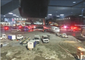 1月5日,在加拿大多伦多皮尔逊国际机场,救援车辆包围了发生碰撞事故的两架客机。