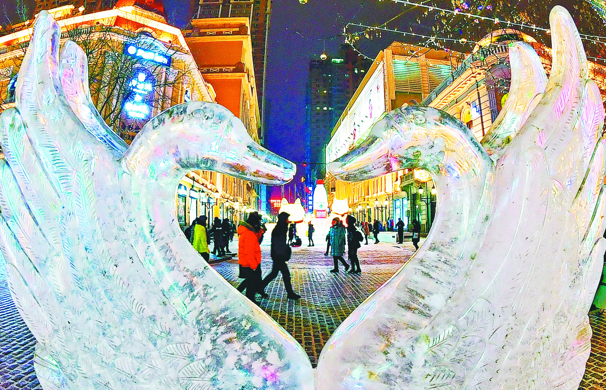 在哈尔滨市道里区中央大街,游客们徜徉在古老的面包石上,欣赏两侧晶莹奇幻的冰雕雪塑。据了解,今年中央大街上共建设了30座冰雪景观,尽显北国冰情雪韵。 本报记者高明摄