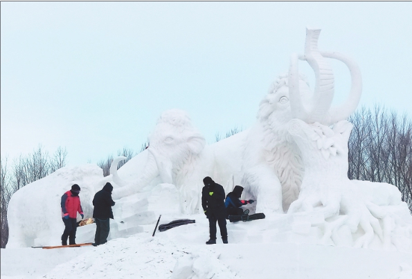 在青冈县东入城口,雕刻工人们正热火朝天地用冰雪雕刻着“猛犸象”,一座座精美的雕塑,一个个美丽的造型,把“中国猛犸象故乡”青冈县的文化底蕴彰显得淋漓尽致,也为青冈小城增添了一道亮丽的风景线。