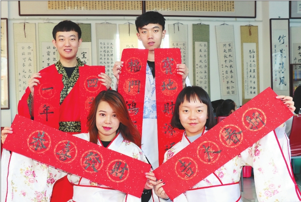 为营造欢乐喜庆的新春佳节气氛,弘扬中华民族迎新春、贴春联的优良传统文化,明水县书法家协会组织会员为本县贫困群众免费书写春联,送去新春的祝福。身着汉服的会员们展示自己书写的春联。 刘畅高伟本报记者程瑶摄