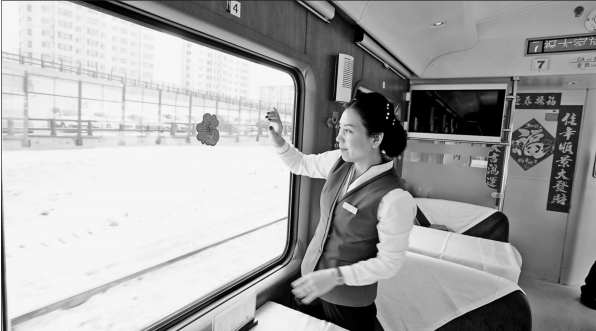 为了营造浓厚的节日气氛,哈尔滨铁路客运段工作人员精心装扮列车车厢,与旅客们喜气洋洋迎新春。这是哈尔滨至海口Z114次餐车长刘晓华在装扮餐车。 程显明本报记者狄婕摄