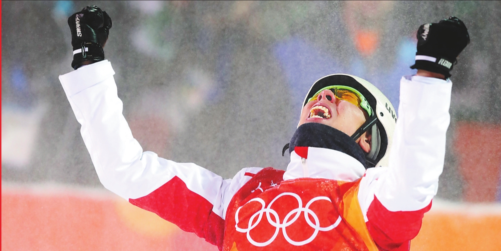 2月18日,中国选手贾宗洋在决赛第三跳后庆祝。 当日,在凤凰雪上公园举行的2018年平昌冬奥会自由式滑雪男子空中技巧决赛中,中国选手贾宗洋以128.05分的成绩获得亚军。 新华社记者吴壮摄