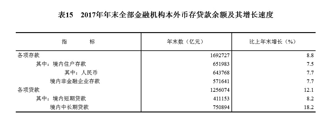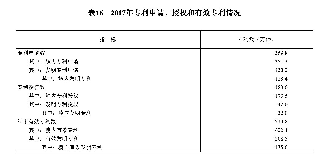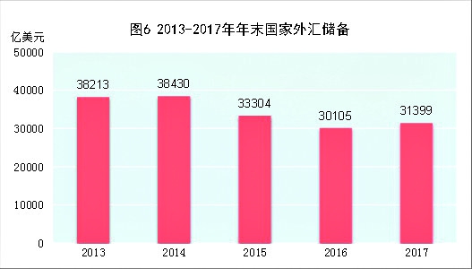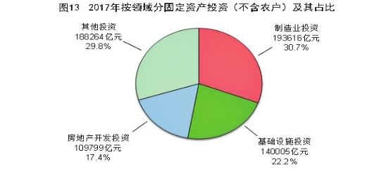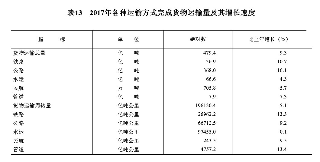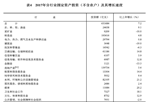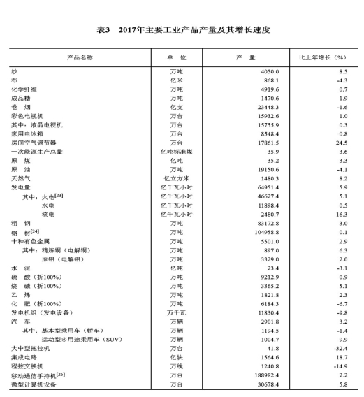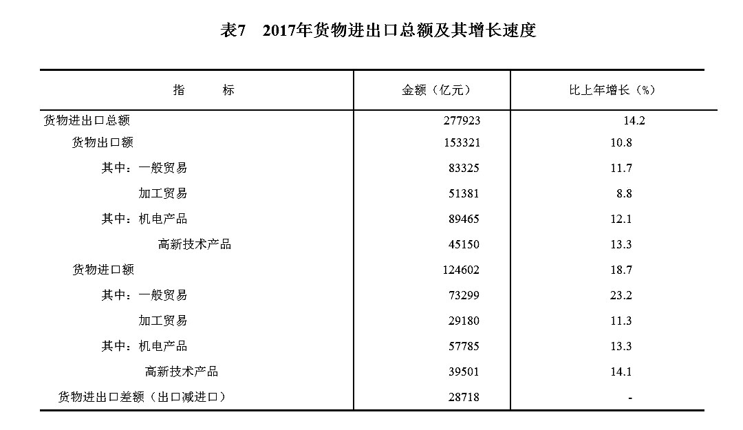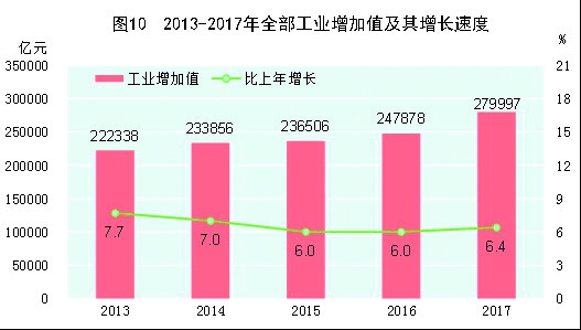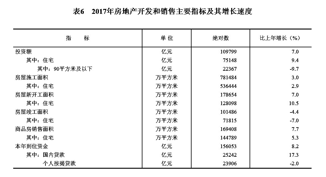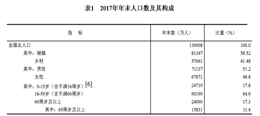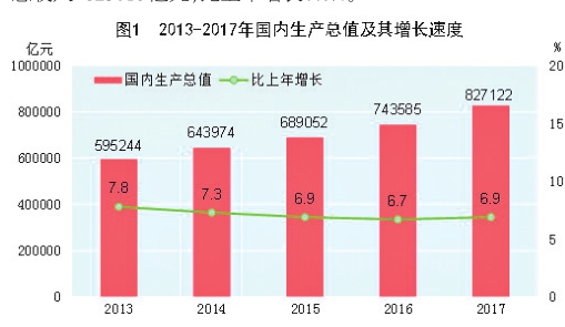中华人民共和国2017年国民经济和社会发展统计公报[1] 中华人民共和国国家统计局 2018年2月28日 2017年,各地区各部门在以习近平同志为核心的党中央坚强领导下,不断增强政治意识、大局意识、核心意识、看齐意识,深入贯彻落实党的十八大和十八届三中、四中、五中、六中、七中全会精神,认真学习贯彻党的十九大精神,以习近平新时代中国特色社会主义思想为指导,按照中央经济工作会议和《政府工作报告》部署,坚持稳中求进工作总基调,坚定不移贯彻新发展理念,坚持以提高发展质量和效益为中心,统筹推进“五位一体”总体布局和协调推进“四个全面”战略布局,以供给侧结构性改革为主线,统筹推进稳增长、促改革、调结构、惠民生、防风险各项工作,经济运行稳中有进、稳中向好、好于预期,经济社会保持平稳健康发展。 一、综合 初步核算,全年国内生产总值[2]827122亿元,比上年增长6.9%。其中,第一产业增加值65468亿元,增长3.9%;第二产业增加值334623亿元,增长6.1%;第三产业增加值427032亿元,增长8.0%。第一产业增加值占国内生产总值的比重为7.9%,第二产业增加值比重为40.5%,第三产业增加值比重为51.6%。全年最终消费支出对国内生产总值增长的贡献率为58.8%,资本形成总额贡献率为32.1%,货物和服务净出口贡献率为9.1%。全年人均国内生产总值59660元,比上年增长6.3%。全年国民总收入[3]825016亿元,比上年增长7.0%。 年末全国大陆总人口139008万人,比上年末增加737万人,其中城镇常住人口81347万人,占总人口比重(常住人口城镇化率)为58.52%,比上年末提高1.17个百分点。户籍人口城镇化率为42.35%,比上年末提高1.15个百分点。全年出生人口1723万人,出生率为12.43‰;死亡人口986万人,死亡率为7.11‰;自然增长率为5.32‰。全国人户分离的人口 [4] 2.91亿人,其中流动人口 [5]2.44亿人。 年末全国就业人员77640万人,其中城镇就业人员42462万人。全年城镇新增就业1351万人,比上年增加37万人。年末城镇登记失业率为3.90%,比上年末下降0.12个百分点。全国农民工 [7]总量28652万人,比上年增长1.7%。其中,外出农民工17185万人,增长1.5%;本地农民工11467万人,增长2.0%。 全年居民消费价格比上年上涨1.6%。工业生产者出厂价格上涨6.3%。工业生产者购进价格上涨8.1%。固定资产投资价格上涨5.8%。农产品生产者价格[8]下降3.5%。 12月份70个大中城市新建商品住宅销售价格月同比上涨的城市个数为61个,比1月份减少5个;下降的为9个,增加5个。 年末国家外汇储备31399亿美元,比上年末增加1294亿美元。全年人民币平均汇率为1美元兑6.7518元人民币,比上年贬值1.6%。 供给侧结构性改革扎实推进。全年全国工业产能利用率 [10] 为77.0%,比上年提高3.7个百分点。其中,煤炭开采和洗选业产能利用率为68.2%,比上年提高8.7个百分点;黑色金属冶炼和压延加工业产能利用率为75.8%,提高4.1个百分点。年末商品房待售面积58923万平方米,比上年末减少10616万平方米。其中,商品住宅待售面积30163万平方米,减少10094万平方米。年末规模以上工业企业资产负债率为55.5%,比上年末下降0.6个百分点。全年规模以上工业企业每百元主营业务收入中的成本为84.92元,比上年下降0.25元;每百元主营业务收入中的费用为7.77元,下降0.2元。全年生态保护和环境治理业、公共设施管理业、农业固定资产投资(不含农户)分别比上年增长23.9%、21.8%和16.4%。 新动能新产业新业态加快成长。全年规模以上工业战略性新兴产业[11]增加值比上年增长11.0%。高技术制造业[12]增加值增长13.4%,占规模以上工业增加值的比重为12.7%。装备制造业 [13]增加值增长11.3%,占规模以上工业增加值的比重为32.7%。全年新能源汽车产量69万辆,比上年增长51.2%;智能电视产量9666万台,增长3.8%;工业机器人产量13万台(套),增长81.0%;民用无人机产量290万架,增长67.0%。全年规模以上服务业[14]中,战略性新兴服务业[15]营业收入41235亿元,比上年增长17.3%;实现营业利润7446亿元,增长30.2%。全年高技术产业投资[16]42912亿元,比上年增长15.9%,占固定资产投资(不含农户)的比重为6.8%;工业技术改造投资[17]105912亿元,增长16.3%,占固定资产投资(不含农户)的比重为16.8%。全年网上零售额 [18]71751亿元,比上年增长32.2%。其中网上商品零售额54806亿元,增长28.0%,占社会消费品零售总额的比重为15.0%。在网上商品零售额中,吃类商品增长28.6%,穿类商品增长20.3%,用类商品增长30.8%。2016年末全国25.1%的村有电子商务配送站点。 发展质量效益改善。全年全国一般公共预算收入172567亿元,比上年增长7.4%[19]。其中税收收入144360亿元,比上年增加13999亿元,增长10.7%。全年规模以上工业企业实现利润75187亿元,比上年增长21.0%。分经济类型看,国有控股企业实现利润16651亿元,比上年增长45.1%;集体企业400亿元,下降8.5%,股份制企业52404亿元,增长23.5%,外商及港澳台商投资企业18753亿元,增长15.8%;私营企业23753亿元,增长11.7%。分门类看,采矿业实现利润4587亿元,比上年增长2.6倍;制造业66511亿元,增长18.2%;电力、热力、燃气及水生产和供应业4089亿元,下降10.7%。全年规模以上服务业企业实现营业利润23645亿元,比上年增长24.5%。全年全员劳动生产率 [20] 为101231元/人,比上年提高6.7%。全年制造业产品质量合格率 [21]为93.71%。 二、农业 全年粮食种植面积11222万公顷,比上年减少81万公顷。其中,小麦种植面积2399万公顷,减少20万公顷;稻谷种