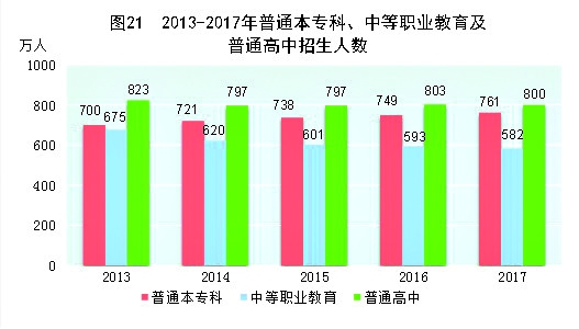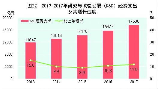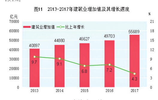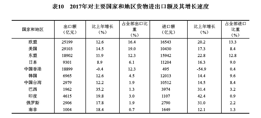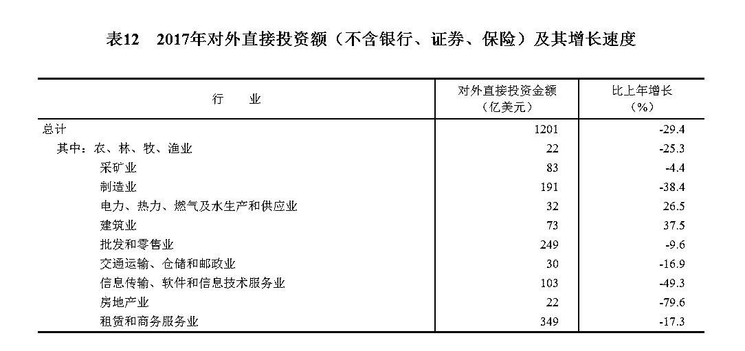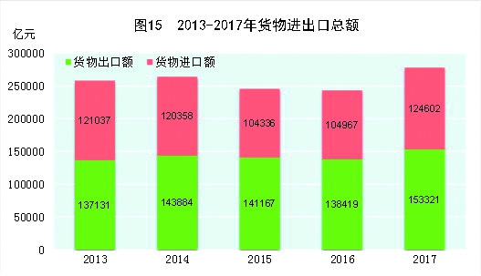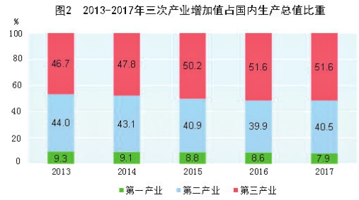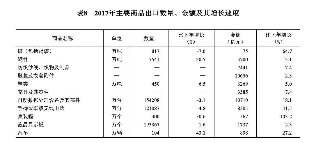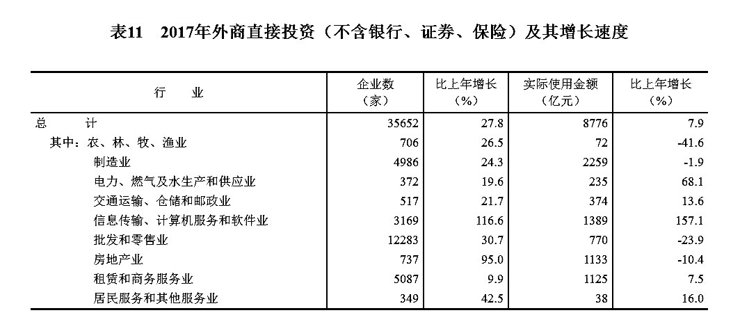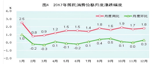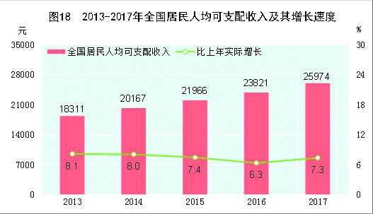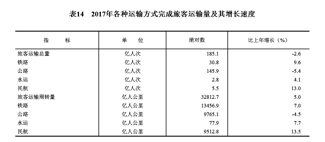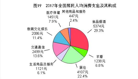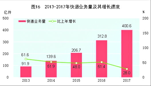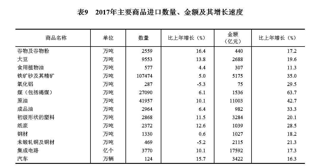 中华人民共和国2017年国民经济和社会发展统计公报[1] 中华人民共和国国家统计局 2018年2月28日 2017年,各地区各部门在以习近平同志为核心的党中央坚强领导下,不断增强政治意识、大局意识、核心意识、看齐意识,深入贯彻落实党的十八大和十八届三中、四中、五中、六中、七中全会精神,认真学习贯彻党的十九大精神,以习近平新时代中国特色社会主义思想为指导,按照中央经济工作会议和《政府工作报告》部署,坚持稳中求进工作总基调,坚定不移贯彻新发展理念,坚持以提高发展质量和效益为中心,统筹推进“五位一体”总体布局和协调推进“四个全面”战略布局,以供给侧结构性改革为主线,统筹推进稳增长、促改革、调结构、惠民生、防风险各项工作,经济运行稳中有进、稳中向好、好于预期,经济社会保持平稳健康发展。 一、综合 初步核算,全年国内生产总值[2]827122亿元,比上年增长6.9%。其中,第一产业增加值65468亿元,增长3.9%;第二产业增加值334623亿元,增长6.1%;第三产业增加值427032亿元,增长8.0%。第一产业增加值占国内生产总值的比重为7.9%,第二产业增加值比重为40.5%,第三产业增加值比重为51.6%。全年最终消费支出对国内生产总值增长的贡献率为58.8%,资本形成总额贡献率为32.1%,货物和服务净出口贡献率为9.1%。全年人均国内生产总值59660元,比上年增长6.3%。全年国民总收入[3]825016亿元,比上年增长7.0%。 年末全国大陆总人口139008万人,比上年末增加737万人,其中城镇常住人口81347万人,占总人口比重(常住人口城镇化率)为58.52%,比上年末提高1.17个百分点。户籍人口城镇化率为42.35%,比上年末提高1.15个百分点。全年出生人口1723万人,出生率为12.43‰;死亡人口986万人,死亡率为7.11‰;自然增长率为5.32‰。全国人户分离的人口 [4] 2.91亿人,其中流动人口 [5]2.44亿人。 年末全国就业人员77640万人,其中城镇就业人员42462万人。全年城镇新增就业1351万人,比上年增加37万人。年末城镇登记失业率为3.90%,比上年末下降0.12个百分点。全国农民工 [7]总量28652万人,比上年增长1.7%。其中,外出农民工17185万人,增长1.5%;本地农民工11467万人,增长2.0%。 全年居民消费价格比上年上涨1.6%。工业生产者出厂价格上涨6.3%。工业生产者购进价格上涨8.1%。固定资产投资价格上涨5.8%。农产品生产者价格[8]下降3.5%。 12月份70个大中城市新建商品住宅销售价格月同比上涨的城市个数为61个,比1月份减少5个;下降的为9个,增加5个。 年末国家外汇储备31399亿美元,比上年末增加1294亿美元。全年人民币平均汇率为1美元兑6.7518元人民币,比上年贬值1.6%。 供给侧结构性改革扎实推进。全年全国工业产能利用率 [10] 为77.0%,比上年提高3.7个百分点。其中,煤炭开采和洗选业产能利用率为68.2%,比上年提高8.7个百分点;黑色金属冶炼和压延加工业产能利用率为75.8%,提高4.1个百分点。年末商品房待售面积58923万平方米,比上年末减少10616万平方米。其中,商品住宅待售面积30163万平方米,减少10094万平方米。年末规模以上工业企业资产负债率为55.5%,比上年末下降0.6个百分点。全年规模以上工业企业每百元主营业务收入中的成本为84.92元,比上年下降0.25元;每百元主营业务收入中的费用为7.77元,下降0.2元。全年生态保护和环境治理业、公共设施管理业、农业固定资产投资(不含农户)分别比上年增长23.9%、21.8%和16.4%。 新动能新产业新业态加快成长。全年规模以上工业战略性新兴产业[11]增加值比上年增长11.0%。高技术制造业[12]增加值增长13.4%,占规模以上工业增加值的比重为12.7%。装备制造业 [13]增加值增长11.3%,占规模以上工业增加值的比重为32.7%。全年新能源汽车产量69万辆,比上年增长51.2%;智能电视产量9666万台,增长3.8%;工业机器人产量13万台(套),增长81.0%;民用无人机产量290万架,增长67.0%。全年规模以上服务业[14]中,战略性新兴服务业[15]营业收入41235亿元,比上年增长17.3%;实现营业利润7446亿元,增长30.2%。全年高技术产业投资[16]42912亿元,比上年增长15.9%,占固定资产投资(不含农户)的比重为6.8%;工业技术改造投资[17]105912亿元,增长16.3%,占固定资产投资(不含农户)的比重为16.8%。全年网上零售额 [18]71751亿元,比上年增长32.2%。其中网上商品零售额54806亿元,增长28.0%,占社会消费品零售总额的比重为15.0%。在网上商品零售额中,吃类商品增长28.6%,穿类商品增长20.3%,用类商品增长30.8%。2016年末全国25.1%的村有电子商务配送站点。 发展质量效益改善。全年全国一般公共预算收入172567亿元,比上年增长7.4%[19]。其中税收收入144360亿元,比上年增加13999亿元,增长10.7%。全年规模以上工业企业实现利润75187亿元,比上年增长21.0%。分经济类型看,国有控股企业实现利润16651亿元,比上年增长45.1%;集体企业400亿元,下降8.5%,股份制企业52404亿元,增长23.5%,外商及港澳台商投资企业18753亿元,增长15.8%;私营企业23753亿元,增长11.7%。分门类看,采矿业实现利润4587亿元,比上年增长2.6倍;制造业66511亿元,增长18.2%;电力、热力、燃气及水生产和供应业4089亿元,下降10.7%。全年规模以上服务业企业实现营业利润23645亿元,比上年增长24.5%。全年全员劳动生产率 [20] 为101231元/人,比上年提高6.7%。全年制造业产品质量合格率 [21]为93.71%。 二、农业 全年粮食种植面积11222万公顷,比上年减少81万公顷。其中,小麦种植面积2399万公顷,减少20万公顷;稻谷种