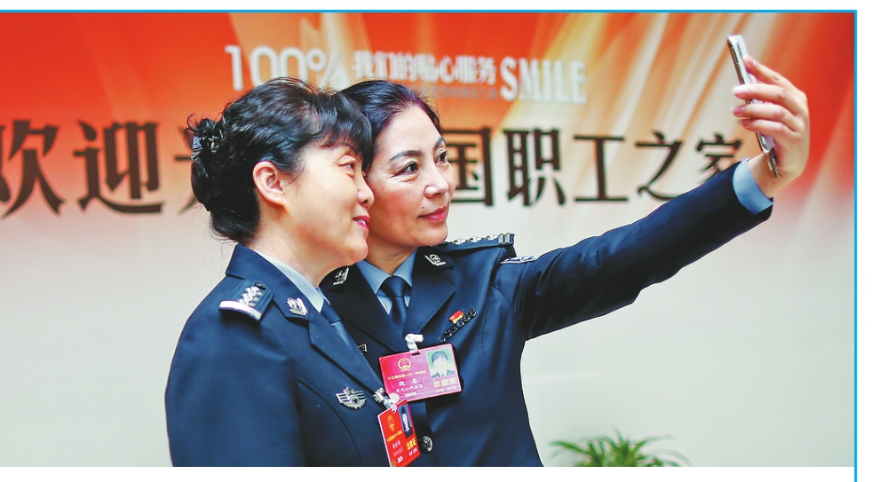 参加十三届全国人大一次会议的我省代表团和陕西代表团是同一个驻地,来自我省基层公安战线的全国人大代表魏春(右),遇到同样是来自基层公安战线的陕西代表团郝世玲代表,共同的岗位,共同的责任,让这对远隔千里的基层警花一见如故,交流参会感受,共勉真情为民。 郑亮本报记者邵国良摄