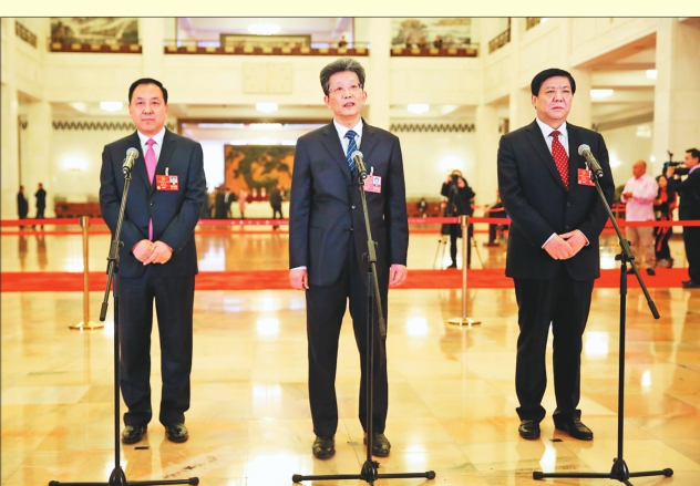 全国人大代表张工(中)、袁桐利(右)、杨茂荣(左)在“代表通道”接受采访。 新华社记者金立旺摄