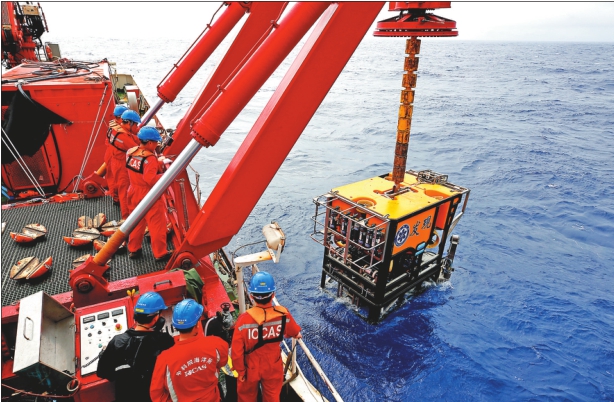 4月1日,“科学”号工程技术人员将“发现”号深海机器人施放到海里。 海山是世界海洋生物多样性研究的热点地区。在国家科技基础资源调查专项“西太平洋典型海山生态系统科学调查”支持下,“科学”号科考船在西太平洋麦哲伦海山全面展开综合调查。 4月1日,“科学”号搭载的“发现”号深海机器人对麦哲伦海山链上的一座海山进行了首次深潜“探访”。 新华社记者张建松摄