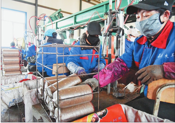 七台河市勃利县嘉源黑木耳种植专业合作社,先后获得“无公害农产品”和“绿色食品”证书。合作社预计每年可带动周边农户增收240万元,人均月收入可达4000元。工作人员正在为木耳菌装袋。 周雪峰摄