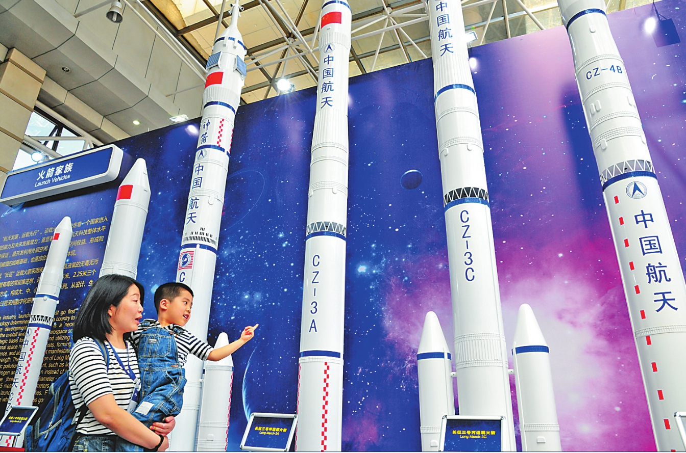 在科普展区,一位母亲带着孩子参观“火箭家族”。