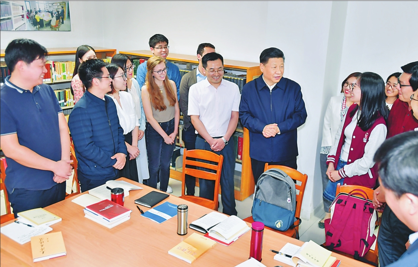 新华社北京5月2日电在五四青年节和北京大学建校120周年校庆日即将来临之际,中共中央总书记、国家主席、中央军委主席习近平来到北京大学考察。习近平代表党中央,向北京大学全体师生员工和海内外校友、向全国各族青年、向全国青年工作者致以节日的问候。他强调,坚持好、发展好中国特色社会主义,把我国建设成为社会主义现代化强国,是一项长期任务,需要一代又一代人接续奋斗。广大青年要成为实现中华民族伟大复兴的生力军,肩负起国家和民族的希望。高校要牢牢抓住培养社会主义建设者和接班人这个根本任务,坚持办学正确政治方向,建设高素质教师队伍,形成高水平人才培养体系,努力建设中国特色世界一流大学。 季春时节,北大校园鲜花盛开,草木葱茏,生机盎然。上午9时许,习近平在中共中央政治局常委、中央书记处书记王沪宁,北京大学党委书记郝平、校长林建华陪同下,首先来到临湖轩,参观“新时代——北京大学近五年成就展”。古色古香的临湖轩里,一块块展板图文并茂,一组组数据清晰直观。习近平认真听取情况介绍,仔细察看北大在文理科学科成就、人才培养、队伍建设、国际交流、社会服务等方面重要成果展示,对北大取得的成绩给予充分肯定。他表示,党的十八大以来,北大继承光荣传统,坚持社会主义办学方向,立德树人成果丰硕,双一流建设成效显著,服务经济社会发展成绩突出,学校发展思路清晰,办学实力和影响力显著增强,看了令人欣慰。他强调,国家发展同大学发展相辅相成。我们要在国家发展进程中办好高等教育,办出世界一流大学,首先要在体现中国特色上下功夫。 临湖轩北侧的小庭院,紧邻未名湖,景色宜人。习近平来到庭院,看望部分资深教授和中青年教师代表,并同他们亲切交谈。他们当中既有邓小南、王缉思、林毅夫、钱乘旦、申丹、杜维明、安乐哲等资深老教授,也有彭锋、渠敬东、余淼杰、蒋朗朗等优秀中青年教师。习近平对他们说,看到各位老教授身体健康、精神矍铄,非常高兴,你们几十年如一日笔耕不辍、悉心育人,为培养党和人民需要的优秀人才作出了积极贡献,我向你们表示敬意。美国籍的汉学大师安乐哲先生,翻译过《论语》、《孙子兵法》等中国传统经典,2013年荣获第六届世界儒学大会颁发的“孔子文化奖”。习近平亲切问他来自哪所大学、来中国多长时间、是否适应这里的生活,并希望他更多向国外介绍中国优秀传统文化。总书记还勉励中青年教师向老一辈专家学者学习,继续在教学和科研上用心耕耘。 近年来,北京大学培养和汇聚了一批具有世界领先水平的科学家、科技领军人才和创新团队,科研综合实力、原始创新能力显著增强。在金光生命科学大楼一层大厅,展示了近年来北京大学在理科、工科、医科等领域的科研成果。习近平认真听取关于学校学科建设、人才队伍建设、科研创新能力提升等情况介绍,并仔细察看新一代干细胞技术、碳芯片技术、微型双光子显微成像系统等科研装置和实物模型。习近平对大家说,看了你们的成果展示,我为你们感到骄傲。创新是引领发展的第一动力,是国家综合国力和核心竞争力的最关键因素。重大科技创新成果是国之重器、国之利器,必须牢牢掌握在自己手上,必须依靠自力更生、自主创新。在这个问题上,我们一定要保持清醒。 (下转第三版) (上接第一版)要继续深化科技体制改革,把人、财、物更多向科技创新一线倾斜,努力在关键共性技术、前沿引领技术、现代工程技术、颠覆性技术创新上取得更大突破,抢占科技创新制高点。高校是科技创新体系的重要组成部分,高校科研人员是我国科技创新的重要队伍。要加强学科之间的协同创新,加强对交叉学科群和科技攻关团队的支持,培养造就更多具有国际水平的科技人才和创新团队。 北京大学是马克思主义在中国传播的发源地,近年来成立了全国第一家马克思主义学院,并于今年1月成立了习近平新时代中国特色社会主义思想研究院。习近平来到这里参观“北京大学与马克思主义主题展览”。习近平认真观看展览,深入了解学校开展马克思主义和新时代中国特色社会主义思想教学、研究情况。他强调,高校马克思主义学院就是要坚持“马院姓马,在马言马”的鲜明导向和办学原则,为巩固马克思主义在意识形态领域的指导地位,推动马克思主义进校园、进课堂、进学生头脑,发挥应有作用。 随后,习近平走进国际马克思主义文献中心,察看馆藏马克思主义典籍,询问“马藏工程”进展情况,称赞他们的工作非常有意义。阅览室里,一些中外学生正在就“解读新时代”进行座谈交流。习近平走到他们中间,认真倾听讨论,并同大家互动交流。总书记问大家为什么选择马克思主义专业、学习这个专业有什么体会,同学们兴奋地一一回答。同学们问总书记“您是一个坚定的马克思主义者,您学习马克思主义有什么好的方法”,总书记热情同大家分享了自己的学习经验。他对在场的外国留学生说,要了解中国,就要了解中国的历史、文化、人文思想和发展阶段,特别是要了解当代中国的马克思主义。习近平强调,北京大学是中国最早传播和研究马克思主义的地方,为马克思主义在中国的传播和中国共产党的成立作出了重要贡献。今年是马克思诞辰200周年,也是《共产党宣言》诞生170周年。我们对马