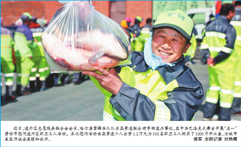 近日,道外区志愿服务联合会会长、哈尔滨雷锋车队队长栾景通联合靖宇街道办事处,在中华巴洛克大舞台开展“五一”劳动节慰问道外区环卫工人活动。本次慰问活动由栾景通个人出资1.2万元为100名环卫工人购买了1000斤开江鱼,为城市美容师送去温暖和关怀。 侯军本报记者刘艳摄
