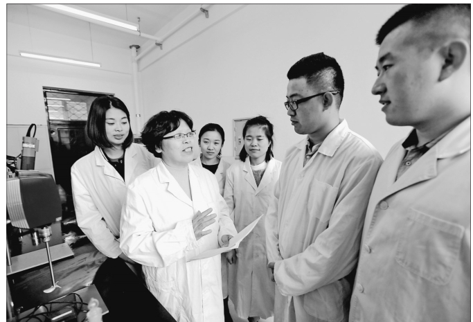 郭成宇(前左)在实验室指导学生进行科研数据分析。