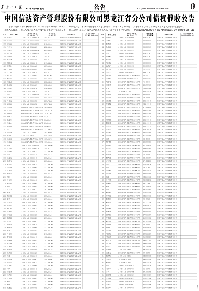 中国信达资产管理股份有限公司黑龙江省分公司债权催收公告