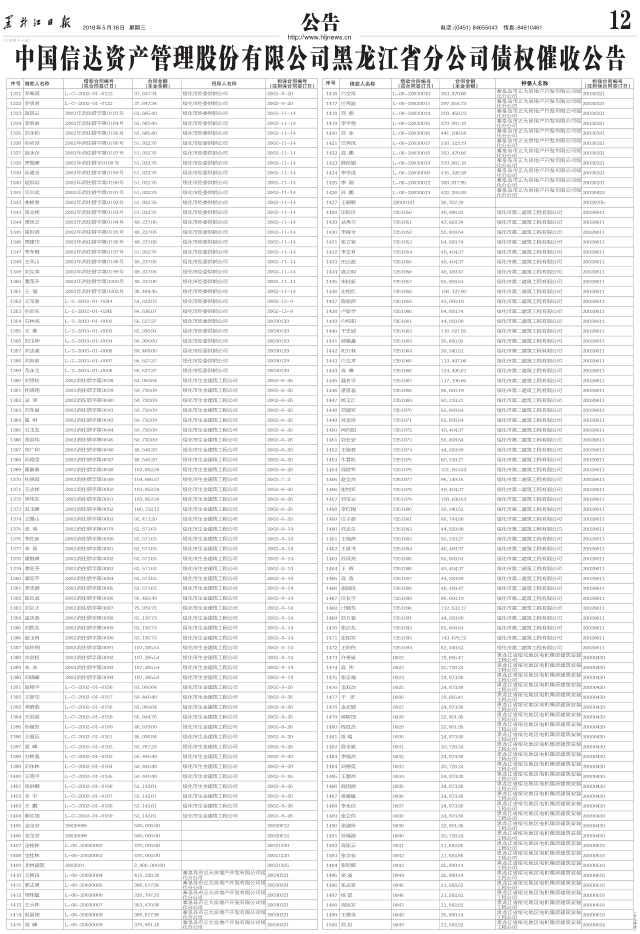 中国信达资产管理股份有限公司黑龙江省分公司债权催收公告