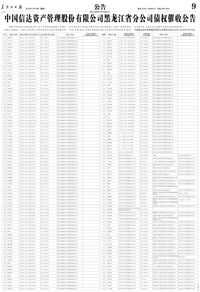 中国信达资产管理股份有限公司黑龙江省分公司债权催收公告