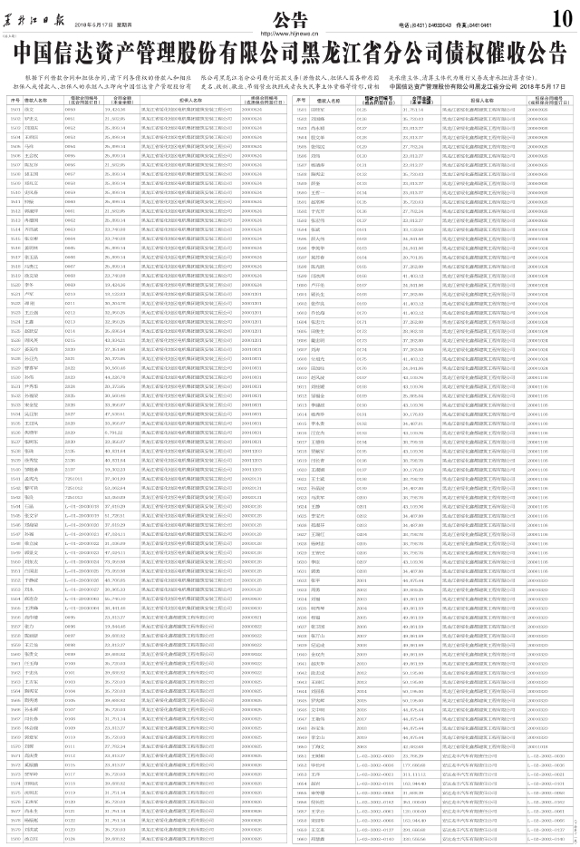 中国信达资产管理股份有限公司黑龙江省分公司债权催收公告