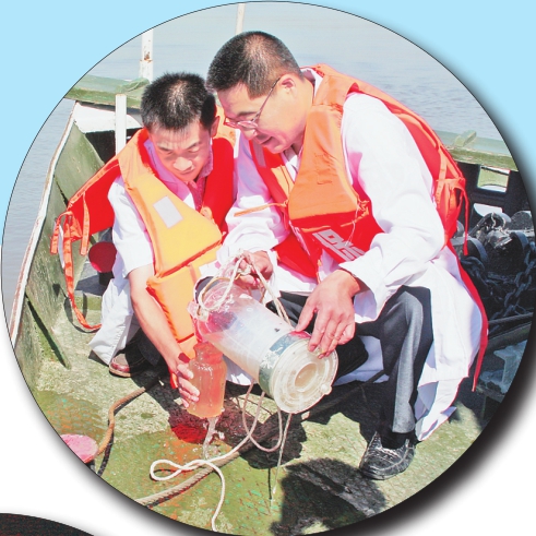 →环保工作人员在松花江上采水样。李厚君摄