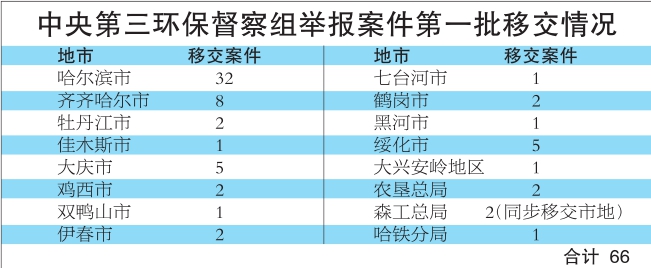 本报讯(吴殿峰记者赵悦含)1日,中央第三环境保护督察组向我省移交第一批信访案件。据悉,在信访举报电话、信箱公布之后,截至5月31日20时,共接到群众举报电话109个,其中有效举报案件66个,现已将首批全部案件转办相关市(地)和部门调查处理。我省坚持边督、边改、边查,坚持做到每件事有着落、有责任、有结果。第一批调查处理结果将于6月5日反馈。 据了解,督察组向我省移交的66个举报案件的问题主要集中于大气污染、水污染、生态破坏方面,涉及13个市(地)、3个部门,其中哈尔滨32个,齐齐哈尔8个,大庆、绥化各5个,牡丹江、鸡西、伊春、鹤岗、农垦总局、森工总局各2个,佳木斯、双鸭山、七台河、黑河、大兴安岭、哈尔滨铁路局各1个(部分案件涉及多个地区或部门)。移交案件中重点督办案件16个,其中哈尔滨6个,齐齐哈尔5个,牡丹江、大庆、双鸭山、绥化、黑河各1个。