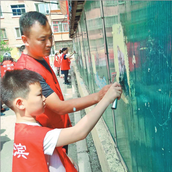 □本报记者李健 “同志们,我们分成几个小组,分别负责清除杂草、墙壁上的小广告、清理清除下来的垃圾。大家开始行动吧!”随着指挥者的一声令下,共青团哈尔滨市委员会的四十余名机关干部身着统一的红色志愿者马甲,胸佩共青团徽,很快投入到义务劳动之中。据团市委机关党委专职副书记孙羽翎介绍,为了响应以“美丽中国我是行动者”为主题的哈市纪念六五世界环境日,团市委3日组织了四十余名机关干部到南岗区和平邨社区进行义务清理垃圾活动。“和平邨社区是我们团市委的共建社区,我们每年至少在社区组织两次义务劳动,冬天帮助他们清除冰雪,夏天帮助他们清理杂草、墙壁上的小广告以及生活垃圾。每次义务劳动都得到了社区居民的大力支持以及肯定。”孙羽翎高兴地对记者说。 在一个个忙碌的红马甲当中,一个小男孩非常引人注目,他在爸爸的帮助下认真地清除小广告。“我叫武千贺,今年10岁了。我从6岁时就跟着爸爸一起参加义务劳动,每次看到整洁的庭院,干净的墙壁,心理别提多舒服了。”从孩子天真朴实的言语中能够体会到他对能参加这样的义务劳动非常开心。孩子的爸爸武晓东对记者说:“带他来一起参加义务劳动,保护环境,就是让他从小就有一种环保意识,对他今后的成长非常有意义。” 经过大家的协同作战,花池里的杂草不见了踪影,墙壁上的小广告也不知所踪,院内一点垃圾也看不到。“希望像这样的环保行动可以常态化,让大家时时刻刻都能有保护环境的意识。这样就能让破坏环境的行为无处藏身。”哈市南岗区革新办事处副主任梁刚对记者说。 10岁的武千贺在铲除小广告。 本报记者李健摄