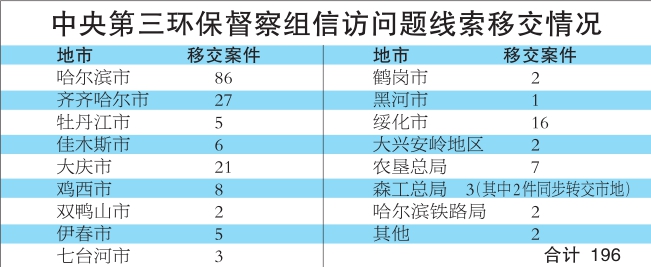 本报讯(吴殿峰记者吴利红)记者从黑龙江省中央环境保护督察整改工作领导小组获悉,截至6月3日20时,我省共接收中央环保督察组转办举报案件3批次,共196件,其中重点案件46件。 按地域划分,196件举报案件中,哈尔滨86件,齐齐哈尔27件,牡丹江5件,佳木斯6件,大庆21件,鸡西8件,双鸭山2件,伊春5件,七台河3件,鹤岗2件,黑河1件,绥化16件,大兴安岭地区2件,农垦总局7件,森工总局3件(其中2件同步转交市地),省水利厅1件,哈尔滨铁路局2件,哈牡哈佳铁路客运专线有限责任公司1件。