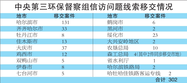 按地域划分,302件信访问题线索中,哈尔滨市131件,齐齐哈尔市33件,牡丹江市8件,佳木斯市13件,大庆市37件,鸡西市12件,双鸭山市5件,伊春市8件,七台河市5件,鹤岗市6件,黑河市2件,绥化市23件,大兴安岭地区2件,农垦总局10件,森工总局4件(其中2件同步移交市地),省水利厅1件,哈尔滨铁路局2件,哈牡哈佳铁路客运专线有限责任公司2件。