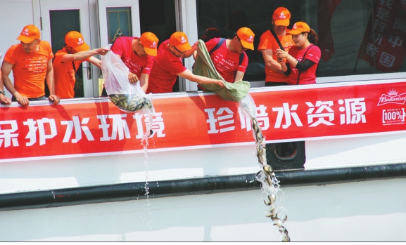 6月5日,佳木斯市环保局和百威英博(佳木斯)啤酒有限公司主办的纪念“六五”世界环境日暨三江环保世纪行宣传活动在松花江畔知青广场举行。主办方提出“积极倡导绿色理念,主动践行绿色生产方式和生活方式,携手共建天更蓝、山更绿、水更清、环境更优美的家园”倡议。志愿者组织开展了松花江沿江步道徒步走、松花江水质监测、松花江地标性鱼苗放流、最美佳木斯书画创作等公益活动。这是志愿者在松花江放流15000尾鱼苗。丁伟光本报记者刘亿服摄