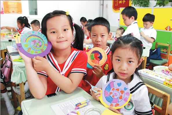 日前,位于南岗区的哈尔滨市电兴幼儿园大班小朋友,在老师的带领下来到了哈尔滨市师范附属小学园丁校区进行参观体验,并与该校一年级的小学生共同上了一堂生动的美术课,近距离感受、体验了小学生的学习生活。哈市电兴幼儿园的两名小朋友与师范附小一年级的学生开心地展示他们的美术作品。 本报记者邢汉夫摄