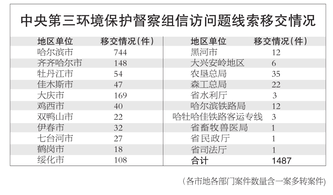 本报15日讯(吴殿峰记者王彦)记者15日从黑龙江省中央环境保护督察整改工作领导小组获悉,截至6月14日20时,我省共接收中央第三环境保护督察组移交信访问题线索14批次,共1487件,其中重点信访问题线索384件。 按地域划分,1487件信访问题线索中,哈尔滨市744件,齐齐哈尔市148件,牡丹江市54件,佳木斯市47件,大庆市169件,鸡西市40件,双鸭山市22件,伊春市32件,七台河市27件,鹤岗市18件,绥化市108件,黑河市12件,大兴安岭地区6件,农垦总局35件,森工总局22件,省水利厅3件,哈尔滨铁路局12件,哈牡哈佳铁路客运专线有限责任公司3件,省畜牧兽医局1件,省民政厅1件,省司法厅1件。各市地各部门案件数量含一案多转案件。 中央环保督察组值班电话 值班电话:0451-84010912受理时间:8:00~20:00邮政信箱:哈尔滨市第450号邮政专用信箱