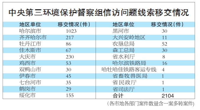 本报讯(吴殿峰记者王彦)记者从黑龙江省中央环境保护督察整改工作领导小组获悉,截至6月19日20时,我省共接收中央第三环境保护督察组移交信访问题线索19批次,共2104件,其中重点信访问题线索681件。 按地域划分,2104件信访问题线索中,哈尔滨市1023件,齐齐哈尔市217件,牡丹江市86件,佳木斯市67件,大庆市230件,鸡西市53件,双鸭山市30件,伊春市45件,七台河市35件,鹤岗市29件,绥化市155件,黑河市30件,大兴安岭地区11件,农垦总局52件,森工总局30件,省水利厅8件,哈尔滨铁路局16件,哈牡哈佳铁路客运专线有限责任公司4件,省畜牧兽医局1件,省民政厅1件,省司法厅1件。各市地各部门案件数量含一案多转案件。 中央环保督察组值班电话 值班电话:0451-84010912受理时间:8:00~20:00 邮政信箱:哈尔滨市第450号邮政专用信箱