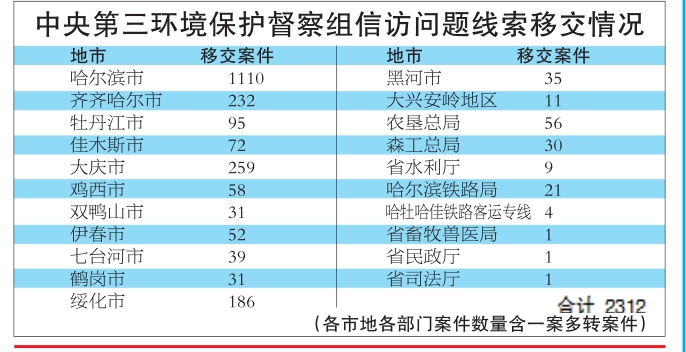本报讯(吴殿峰记者王彦)记者从黑龙江省中央环境保护督察整改工作领导小组获悉,截至6月21日20时,我省共接收中央第三环境保护督察组移交信访问题线索21批次,共2312件,其中重点信访问题线索773件。 按地域划分,2312件信访问题线索中,哈尔滨市1110件,齐齐哈尔市232件,牡丹江市95件,佳木斯市72件,大庆市259件,鸡西市58件,双鸭山市31件,伊春市52件,七台河市39件,鹤岗市31件,绥化市186件,黑河市35件,大兴安岭地区11件,农垦总局56件,森工总局30件,省水利厅9件,哈尔滨铁路局21件,哈牡哈佳铁路客运专线有限责任公司4件,省畜牧兽医局1件,省民政厅1件,省司法厅1件。各市地各部门案件数量含一案多转案件。