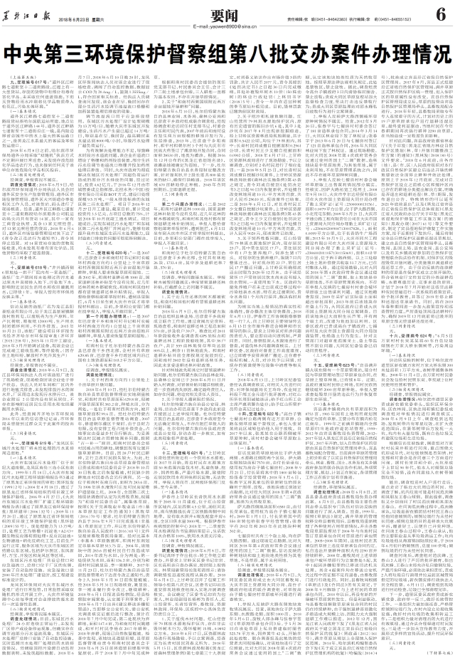 2018年6月8日,中央第三环境保护督察组向我省转办第八批次,共137件举报案件,其中重点案件30件,已办结29件,受理编号分别为609、610、611、612、613、614、615、616、617、618、619、620、621、622、623、624、625、626、627、628、629、630、631、632、633、634、636、637、638;未办结1件,受理编号为635号。具体情况如下: 一、受理编号609号:“2016年以来,三道关镇丰收村村书记郝某某,将村里林地、耕地、湿地用于填埋工业垃圾、生活垃圾和建筑垃圾,总面积达1058亩,并在填埋垃圾后的土地上违规建房建厂。此外,郝某某在二道岭子山上破坏林地建大型垃圾场和墓地谋利,破坏生态环境。” (一)基本情况 郝某某,姓名郝新利,现任牡丹江市爱民区三道关镇丰收村党支部书记。多年以来,丰收村村委会一直在北安林场林地内倾倒生活垃圾。二道岭子山上存在擅自改变林地用途的违法行为。 (二)核实处理情况 经调查,举报情况基本属实。 调查处理情况: 1、关于“将村里林地、耕地、湿地用于填埋工业垃圾、生活垃圾和建筑垃圾,总面积达1058亩在填埋垃圾后的土地上违规建房建厂”问题核实情况。 2018年6月10日下午,北安林场林政管护执法人员到达现场进行调查。经调查核实,丰收村村委会倾倒垃圾的地点位于北安林场24林班1小班内,倾倒的垃圾为露天堆放,没有进行填埋处理,多年来累计占用林地1925平方米。6月11日,市林业局责令丰收村村委会在6月20日前将倾倒的生活垃圾全部运至牡丹江市指定垃圾处理场;6月12日,对其送达了《行政处罚听证权利告知书》和《林业行政处罚先行告知书》。下一步,将按照法定程序下达行政处罚决定,对其擅自改变林地用途的行为处以20元/平方米,共计38500元的罚款,限期恢复原状。 经牡丹江市林业局调查,位于北安林场12、13、24林班和丰收村4林班的127.578亩国有和集体林地,2012年开展农村集体土地所有权确权登记时,该宗地地类即为设施农用地、建设用地和坑塘水面,并非林地,确定权属界线时,北安林场与原北安乡(现三道关镇)丰收村签订了《土地权属界线协议书》,并在“爱民区北安乡丰收村权属界线图”盖章确认,该宗地所有权属丰收村所有,市林业局按现状地类调查进行确权登记,并颁发集体土地所有证,于2012年被纳入丰收村土地范畴。现已陆续被丰收村村委会发包给2家企业和5个自然人,被建成房屋、鱼池等。 2018年6月10日现场调查时发现,2018年4月牡丹江市国土资源局工作人员现场实际测量,该地块占地总面积为17436平方米,其中,占用耕地11909平方米,其他草地面积1334平方米,河流水面面积1841平方米。2018年5月3日,牡丹江市国土资源局对三道关镇丰收村委会下达了《责令改正违法行为通知书》(牡国土资监改〔2018〕A-11号),责令其90日内恢复原状,逾期未恢复,将按照破坏耕地行为移送公安机关追究刑事责任。 经市综合行政执法局2018年6月11日现场约谈,2018年6月12日调查询问,违规建房建厂地位于老牡三公路东侧,丰收村南侧,占地面积795平方米,共有建筑物三处,合计面积为225.88平方米(53.75平方米、159.4平方米、12.73平方米)。经与三道关镇丰收村村委书记郝新利核实,此处是村集体的乡村建设用地,原来就是平整的预留地,用于建设需要,不存在用垃圾填埋。三处建筑物是2016年10月,根据采摘庄园的实际需要而建设的,用于办公、项目指挥和夜间看护,2017年10月建设完成并投入使用。经核查,该三处建筑物占地为村镇集体建设用地,未取得规划部门的审批,属违法建设,市综合行政执法局将依据相关法律法规进行查处。 2、关于“在二道岭子山上破坏林地建墓地谋利,破坏生态环境”问题核实情况。 北安林场进行调查后,丰收村于2018年6月12日提供了与陈凤兰签订的《联营联建协议》。2013年5月,丰收村村委会与陈凤兰签订了《联营联建协议》,将位于二道岭子(北安林场24林班2小班范围内)的面积1600平方米、地类为林业用地的无林地发包给陈凤兰建设浓缩家庭农场。随后,陈凤兰在此无林地内违法建设封闭围墙300延长米,圈占院落3956平方米。现院内处于荒芜状态,没有发现与坟墓相关的建筑和设施。此案件已完成现场勘察,正在收集相关证据,按照《行政处罚法》、《森林法》、《森林法实施条例》等相关法律法规的规定,在法定时限内完成处罚。 (三)问责情况 无。 二、信访编号610号:“2010年左右,三道关镇三道关村副书记付某某破坏7000多平方米林地和耕地盖房挖鱼池。2015年,付某某在三道关国家森林公园内破坏原始森林1万多平方米,伐树后用土掩盖树根,挖蛤蟆坑捕捉野生林蛙,严重破坏生态环境,造成水土流失,举报人要求依法追究其刑事责任。” (一)基本情况 付某某,姓名付洪顺,现任牡丹江市爱民区三道关镇三道关村副书记。2002年,付洪顺从北安乡(现三道关镇)三道关一村承包了14400平方米土地(其中,林业用地8345平方米)用于养牛,承包期限为30年。2006年~2010年期间,付洪顺陆续在其承包林地内建设房屋和蓄水池等设施。除此之外,付洪顺还于2008年在三道关国家森林公园(83林班7小班、13小班)内,挖了两个用于养牛的蓄水池。 (二)核实处理情况 经调查,举报情况基本属实。 调查处理情况:接到信访转办件后,2018年6月9日,三道林场林政管护人员到达现场进行调查。经调查,付洪顺在三道关一村建设的房屋已在2015年9月前自行拆除,但房屋残骸仍破坏林地57平方