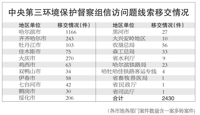 本报讯(吴殿峰记者王彦)记者从黑龙江省中央环境保护督察整改工作领导小组获悉,截至6月22日20时,我省共接收中央第三环境保护督察组移交信访问题线索22批次,共2430件,其中重点信访问题线索829件。 按地域划分,2430件信访问题线索中,哈尔滨市1166件,齐齐哈尔市243件,牡丹江市103件,佳木斯市75件,大庆市270件,鸡西市63件,双鸭山市34件,伊春市58件,七台河市42件,鹤岗市30件,绥化市206件,黑河市27件,大兴安岭地区10件,农垦总局56件,森工总局33件,省水利厅9件,哈尔滨铁路局23件,哈牡哈佳铁路客运专线有限责任公司4件,省畜牧兽医局1件,省民政厅1件,省司法厅1件。各市地各部门案件数量含一案多转案件。 中央环保督察组值班电话 值班电话:0451-84010912受理时间:8:00~20:00 邮政信箱:哈尔滨市第450号邮政专用信箱