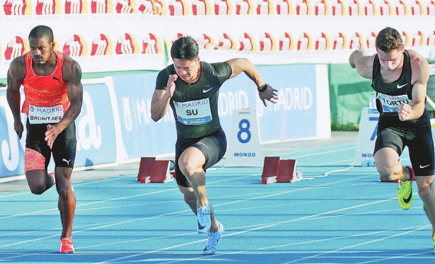 2018年6月22日,苏炳添(中)在男子100米预赛中。当日,在西班牙马德里举行的国际田联世界田径挑战赛马德里站比赛中,中国选手苏炳添以9秒91的成绩获得男子100米冠军,不仅刷新了另一名中国选手谢震业三天前刚刚创造的9秒97的全国纪录,并且追平了卡塔尔归化选手奥古诺德创造的9秒91的亚洲纪录。 新华社发