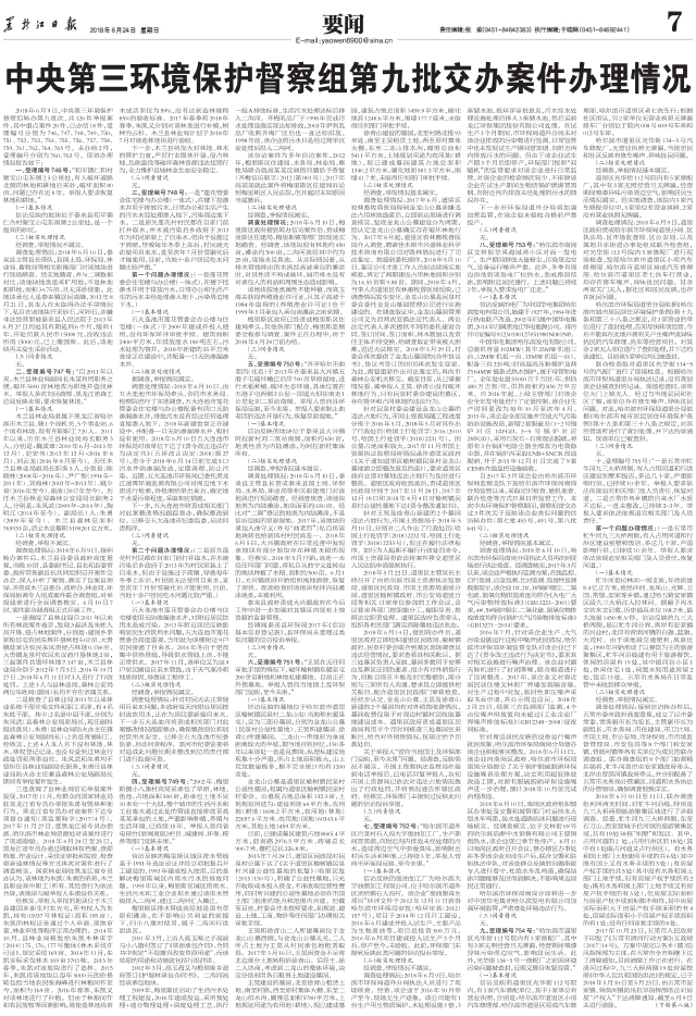 2018年6月9日,中央第三环境保护督察组转办第九批次,共126件举报案件,其中重点案件20件,已办结18件,受理编号分别为746、747、748、749、750、751、752、753、754、755、756、757、758、759、761、762、764、765号。未办结2件,受理编号分别为760、763号。现将办理情况报告如下: 一、受理编号746号:“和平镇仁和村聚宝山屯东侧2.5公里处,有人破坏道路北侧的林地和耕地后采砂,破坏面积80亩,问题已存在近8年。举报人要求恢复林地和耕地。” (一)基本情况 信访反映的地块位于泰来县和平镇仁合村聚宝山屯东南侧2公里处,是一个废弃的砂坑。 (二)核实处理情况 经调查,举报情况不属实。 调查处理情况:2018年6月10日,泰来县主管县长带队,县国土局、环保局、林业局、畜牧局等相关职能部门对该地块进行现场踏查。经实地踏查,并与二调数据对比,该地块地类是采矿用地,不是林地和耕地,面积34.75亩,且无采砂现象。此地块承包人是泰来镇居民高峰,2012年8月21日,其本人在未取得合法手续情况下,私自在该地块开采砂石、河卵石,涉嫌非法经营罪被泰来县人民法院于2013年6月27日判处其有期徒刑6个月,缓刑1年,并处罚款人民币15000元,没收违法所得15000元,已上缴国库。此后,该地块再未发生采砂活动。 (三)问责情况 无。 二、受理编号747号:“自2011年以来,木兰县林业局副局长朱某利用职务之便,破坏5000亩林地改为耕地并盗伐林木。举报人多次向民政部、黑龙江省森工总局反映未果,要求恢复林地。” (一)基本情况 木兰县林业局隶属于黑龙江省哈尔滨市木兰县,辖1个局机关、5个事业站、6个国有林场,现有在职职工720人。2011年以来,历任木兰县林业局局长职务3人,分别是:魏成章(2010年6月~2013年12月)、史宏伟(2013年12月~2016年8月)、刘云龙(2016年8月至今)。历任木兰县林业局副局长职务5人,分别是:陈晓林(2008年~2016年)、尹广智(1994年~ 2011年)、刘海林(2002年~2013年)、姚少青(2016年至今)、崔波(2017年至今)。历任木兰县林业局森林公安局局长职务2人,分别是:朱凤武(2009年~2014年)、陶明江(2014年至今)。副局长1人:朱勇(2009年至今)。木兰县森林总面积765933亩,活立木总蓄积5100261立方米。 (二)核实处理情况 经调查,举报不属实。 调查处理情况:2018年6月9日,接到转办案件后,木兰县县委县政府高度重视,当晚10时,县委副书记、县长和县委常委、政府常务副县长共同组织召开案件交办会,深入分析了案情,落实了包案县领导,并责成木兰县委办、政府办、林业局、环保局抽调专人组成案件联合调查组,对举报线索进行全面调查核实。6月10日7时,案件联合调查组正式开展工作。 一是调阅了县林业局自2011年以来所有林政案件卷宗,发现3起涉及朱姓人员开垦、侵占林地案件,分别是:建国乡李家粉坊屯农民朱辉开垦林地5.02亩、大贵镇陆家店农民朱凤贵侵占林地0.154亩、大贵镇龙泉村农民朱汉清开垦林地2亩,三起案件共毁坏林地7.147亩,木兰县林业局分别于2012年7月5日、2016年10月27日、2018年6月11日对3人进行了行政处罚。上述3人与县林业局、森林公安局两位朱姓局(副局)长均不存在亲属关系。 二是核查了县林业局2011年以来林业系统干部任免文件和职工名册,有4名朱姓干部。其中:2名是中层干部,分别为朱凤武(县森林公安局原局长,现任副科级侦查员)、朱勇(县林业局防火办主任兼县森林公安局副局长);2名是普通职工。经核实,上述4人本人名下没有林地、林木、林权登记记录,也没有受到过林业行政处罚和刑事追究。朱凤武和朱勇均不曾担任县林业局副局长职务,朱勇任县林业局防火办主任兼县森林公安局副局长期间有举报案件发生。 三是查阅了县林业局信访举报案件发现,2017年11月,有群众向国家林业局驻黑龙江省专员办举报朱勇有毁林种地行为。黑龙江省专员办对该案件下达专项督办通知(黑监案转字〔2017〕4号)。2017年11月27日,受黑龙江省专员办指派,哈尔滨市林业局资源处对该案件进行了现场勘验。2018年4月24日至25日,黑龙江省专员办通过调取林权档案、资源档案、作业设计、采伐证审批和发放、检查更新造林情况等方式再次对案件进行了调查核实。国家林业局驻黑龙江省专员办认为,该林地为朱凯(朱勇的弟弟,木兰县职业高中职工)所有,其经营行为依法合规,该地块与被举报人朱勇没有关系。 经核实,举报人举报的地块位于木兰县建国乡新生村东光屯,所有权人为朱凯,持有03937号林权证(面积195亩)。朱凯的林权证是通过个人申请、现地审查、林业审批等程序正常办理的。2014年10月,县林业局核发给朱凯木林采字〔2014〕175、176、177号集体《林木采伐许可证》,规定采伐169亩。2014年11月,朱凯实际采伐林木169亩3703株。2015年春季,朱凯对该地块进行了造林。2015年,朱凯将该地块以每年5000元的价格转包给当地农民张海峰进行林粮间作至今,面积为169亩。2016年春季,朱凯又对该林地进行了补植。但由于林粮间作和农民放牧等因素影响,致使造林地块苗木成活率仅为59%,没有达到造林规程85%的验收标准。2017年春季和2018年春季,朱凯又分别对该林地进行补植,树种为云杉。木兰县林业局计划于2018年7月对该造林地块进行验收。 下一步,木兰县将加大对林地、林木的管护力度,严厉打击毁林开垦、侵占林地、乱砍滥伐等破坏森林资源违法犯罪行为,全力维护县域林业生态安全稳定。 (三)问责情况 无。 三、受