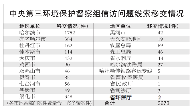 本报讯(吴殿峰记者王彦)记者从黑龙江省中央环境保护督察整改工作领导小组获悉,截至7月2日20时,我省共接收中央第三环境保护督察组移交信访问题线索32批次,共3673件,其中重点信访问题线索1449件。 按地域划分,3673件信访问题线索中,哈尔滨市1752件,齐齐哈尔市384件,牡丹江市162件,佳木斯市114件,大庆市432件,鸡西市90件,双鸭山市46件,伊春市85件,七台河市56件,鹤岗市49件,绥化市348件,黑河市42件,大兴安岭地区19件,农垦总局69件,森工总局46件,省水利厅14件,哈尔滨铁路局27件,哈牡哈佳铁路客运专线有限责任公司5件,省畜牧兽医局1件,省民政厅1件,省司法厅3件,省环保厅2件。各市地各部门案件数量含一案多转案件。