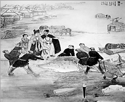 □刘战峰 在江湾处,平阔的松花江水昼夜不息地流淌着。这处江湾我去过好多次了,习惯了品尝这里的江水炖江鱼,原汁原味。江鲤江鲫江虾,都是这里的美品。可是,当地的渔民们并不为此过分的炫耀,只不过觉得松花江是他们赖以生存的母亲河,大有恭敬之心。他们吃着大江的,喝着大江的,从来就不敢忘本。每年的开江之时,渔民怀着敬畏的心,要在江岸焚香祭拜水神,神案上奠献了酒肉和美食。水神是否沾了唇,渔民们都并不知晓,但水神还要年年的祭祀,许是哄它们高兴了,在鱼汛来临的时候,有个好的鱼船满仓的收获。 当地的人,烹炖鲜鱼的技法很别致,极其简化,很省事的,毫不繁琐。吃法上也不俗气,深得舌尖上的造化之功,令人垂涎不已。尤其吃生鱼的时候,清爽口舌,食欲陡增,容易吃出了馋意,很好的渔家的下酒菜,那是有意思的事。一杯老酒下肚,话题自然多了起来。说得较多的是这里辽金时期的陈年往事,在他们的口头上咀嚼并不稀罕。都是闲话,说的大多是头鱼宴的故事,仿佛一个话头的引领,辽金千年的流风余韵就漫散了,羼杂在酒的味道中,在迸溅的唾沫里,聊以淹没那些摇船归来的清闲时光。 一代代的渔民们有口凭说,在辽金时期,这里的沿江一带是当年辽国皇帝的春猎场。那时毕竟人烟稀少,属于草莽荒泽之域,不尽的奇花异草,还有绿波之上肥美的珍禽。这个能征善战的马背上的大辽(契丹)民族,包括皇帝及其皇戚贵族,格外迷恋着这里的江水野味,开始了多年风流享乐的域外生活。据说,在这儿,头鱼宴是契丹人最好的口头福。 据有关的辽史记载,辽代天祚帝在位的天庆二年(公元1112年)的春天,天祚帝耶律廷禧亲驾这里的混同江行宫钩鱼,并设置头鱼宴,招待臣下和当时的女真部落首领。当辽皇帝亲自在冰眼上钩鱼,钩住第一条头鱼后,并以其设宴,命名为“头鱼宴”。《燕北杂记》上这样记载:“主与其母皆设帐冰上,使人于河上下驱使集,主于断透冰眼中用绳钩掷立,无不中者。遂纵绳信今去,其鱼倦,即曳绳出之,谓之得头鱼:遂相与作乐上寿。” 从此以后,每年正月辽皇帝都要进行春猎一次,设置头鱼宴。他们的春猎范围多是在宁江州属地,就是现在黑龙江省的茂兴湖一带。他们的鱼猎——冰上钩鱼地点在嫩江下游的洮儿河、月亮泡、乌兰诺尔、察干泡一带进行。 说到底,这些都与那时候的春捺钵有关系。捺钵,通古斯语为钩鱼打猎。当大辽皇帝带着大臣嫔妃,来到混同江行宫、鸭子河的沿江一带,须经60天之多的行程。同时车驾启行于松嫩之滨,少不了进行“春搜”(即渔猎)。在春山秋水之间游玩获猎,也通常是契丹人的天性。 有辽史记载,辽帝的御驾一到捺钵地,便指令辽兵将士在冰上搭起帐篷,凿冰取鱼,大摆头鱼宴,犒赏群臣。待湖泊的冰面一旦消溶,日渐转暖,他们便要放出海东青了,去捕捉江上轻姿曼妙的天鹅。辽皇帝不但欣赏天鹅秀逸清纯之形态,还极愿欣赏海东青捕击天鹅的精彩画面。待海东青用钢钩似的利爪捕获到了天鹅后,皇帝便令人取鹅脑饲喂海东青,是为恩赐。辽皇帝捕到的第一只天鹅,经过御厨美味的烹饪,便是“天鹅宴”。 当江上凿出了冰眼儿,打捞出鲜鱼后,辽国的君臣们便开始举行“头鱼宴”。宴会上,趣味来了,美酒美人,尽情品啖,由契丹、女真各部的人为皇帝载歌载舞,还有少数民族首领头插天鹅毛,赤膊裸背,腰系响铃,环佩叮当,或歌或舞,沉浸其间。一些膘悍的莽汉和勇士,还当场表演呼鹿、搏熊、刺虎、斗牛、射兔等动作,以博取辽国君臣的欢悦之心。女真部落的男丁头插鸟尾、鹿角和如同神鬼一样的面具,身穿插满野鸟羽翎的奇怪服装,手持打击乐器,在亢奋的鼓乐声里手舞足蹈,直至斜阳瑟瑟,半江绯红,欢娱活动才能平息。 头鱼宴不过是吃的艺术,玩的行为。有目共睹,历代王朝的没落,也是因为上层社会贵族们奢靡的吃喝玩乐,才让一个个盛世基业破落荒废了,成为落花流水。我在江岸行走的时候,可以想象出在八百多年前,这里有过的浩荡的仪仗和车驾,人马欢腾,“从行山谷间,花木如绣,车服相错,人望之以为神仙”,如此的场景委实引人遐想,不尽的神往。但是,只能是陡增想象罢了,在青绿的山水之间,变成了对某些历史人物的一种追思与凭吊。