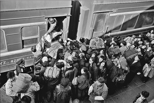1994年,哈尔滨站台上蜂拥上车的旅客。 王福春摄