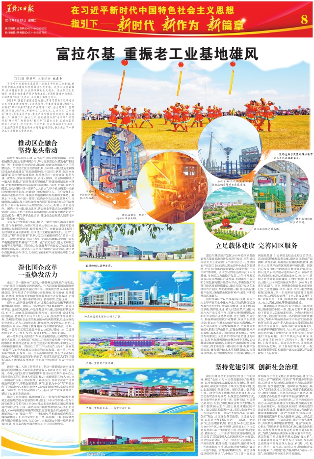 □文/摄邵英明本报记者姚建平 齐齐哈尔市富拉尔基区是一座驰名中外的工业重镇,曾为新中国工业建设和发展做出巨大贡献。这里工业基础雄厚、农业特色明显、社会各项事业长足进步。是全国文化先进区、全国非物质遗产保护先进单位、全国科技进步先进区、全国教育“两基”先进区、全国群众体育先进区。 2018年,富拉尔基区委区政府认真学习贯彻习近平总书记系列重要讲话精神,全面落实省、市委决策部署,围绕“工业强省”目标和全市“重点产业倍增计划”,全力建园区、优环境、抓项目、强产业,牢固树立“工业立区、工业兴区、工业强区”理念,聚焦主导产业、重点产业和重点项目建设,着力做精一产、做强二产、做大三产,做好改造升级“老字号”、深度开发“原字号”、培育壮大“新字号”三篇大文章,目前全区呈现出人心向上、经济发展、民生改善、社会和谐的良好局面,工业经济发展呈现出稳中向好的良好态势,奋力走出了一条老工业基地振兴发展之路。 推动区企融合坚持龙头带动 富拉尔基区因企而建,因企而兴,辖区内有中国第一重型机械集团、建龙北满特钢公司、华电能源富拉尔基发电厂和热电厂等一批驰名的大型企业,推动区企融合发展是全区的首要任务。全区建立区企合作新机制,与中国一重、建龙北钢等区域龙头企业建立“高层战略协商、中层对口联系、基层全面融通”的区企合作议事机制,每季度召开一次座谈会,每月沟通一次情况,实现沟通零距离、合作无障碍。先后协调解决了一重大件运输、厂前停车场和智能化厂房建设规划及树木移植、北钢水源地和原料运输等实际问题。同时,加强区企协作配套,主动对接中国一重新“七大板块”,每个板块确定一名副区级领导牵头包保,明确责任单位和责任人。充分发挥机电装备产业协会作用,承接技术溢出和产品外委加工任务。截至2017年末,与中国一重签订战略合作协议企业增至9户,在铸锻造、装配以及小型机加件等方面开展全域合作,合同金额由2016年不足8000万元增加到近3亿元,配套比例明显提升。围绕中国一重、建龙北钢、紫金铜业等重点企业和招商引资项目,将其下游产业链实施精准招商,积极谋划推进轻资产运营;配合一重与多家企业洽谈,使这些企业有望入驻西北中国一重配套产业园。 全区深化“放管服”改革,推行“一窗式”审批,再造工作流程,简化办事程序,办理时限压缩比例达50.5%。探索项目模拟审批,变串联为并联,提前做好工作。在紫金项目上仅用1天时间就完成全部审批,为项目开工建设赢得先机。建立“三三联动”和“四级联系”机制,切实打通服务群众“最后一公里”。开展区级领导“九联九促进”活动,协调解决中国一重和华电能源富拉尔基电厂“三供一业”移交地方、建龙北钢职工安置等实际问题。同时全力加强服务平台建设,为企业发展提供坚强保障。建立燕山大学齐齐哈尔产业研究院,确定12个首批转化合作项目,为全区乃至全市产业发展及项目生成提供智力支持。 深化国企改革一重焕发活力 走进中国一重各分厂车间,一排排林立的轧辊气势恢宏,一台台现代化机器发出阵阵轰鸣。作为我国装备制造领域的领军企业,地处富拉尔基区的中国一重集团历经60多年的发展变迁,如今形成了专项装备、核电设备、石化装备、高端装备、新材料、现代服务业和新能源装备等七大业务板块,企业不断追求高起点、高标准和高品质,装备中国,立身世界。 近年来,由于受宏观环境、市场及企业历史包袱等诸多因素的影响,中国一重陷入了历史罕有的困难和挑战。合同订单不足、货款回收困难、产品任务量不均衡、经济运行状况不佳,2015年、2016年连续出现巨额亏损。面对困难,企业积极应对挑战,特别是自2016年5月份以来,坚决贯彻落实党中央、国务院对国有企业改革发展的各项决策部署,以全面深化企业改革为动力,以解放思想、转变观念、改变作风为抓手,以脱困振兴为目标,打响了瘦身健体、提质增效攻坚战。今年一季度,一重集团实现工业总产值23.2亿元,增长70%;工业增加值3.36亿元,增长26.7%;税金1.12亿元,增长43.8%。 在一重集团轧电制造厂车间里放眼望去,壮观的生产场景令人震撼。轧电制造厂机加二班经理孙波指着一个个庞大的部件自豪地对记者说,目前企业生产形势好转,干部工人工作积极性都很高。曾经员工的工作状态是“让我干”,现在是“我要干”,如今大家都关心企业的未来发展。在一重工作30多年的孙波,以身为一名一重人而感到骄傲,经历过企业起伏的他,如今坚信企业的好时候到了,他经常组织工人们学习业务知识,不断提高技术水平,决心将“中国制造”变成“中国创造”。 谈到一线工人的工作热情时,中国一重重型装备事业部副总经理刘轶说:“去年企业营业收入102.95亿元,创历史新高。今年,我们又将订货和销售年度目标定为两个150亿元,同时将员工的工资纳入年度目标,计划提高职工收入9%,进一步调动广大职工的积极性。”刘轶表示,目前企业在市区两级政府支持下,不断创新思想,从“以自我为中心”向“开放合作”的思路转变,不断拓宽业务,加强多领域合作,实现互利共赢。2018年,公司先后实现了“元月开门红”“首季满堂红”,延续了良好的发展态势。 随之而来的捷报,再次吹响了以一重为代表的富拉尔基老工业基地的振兴发