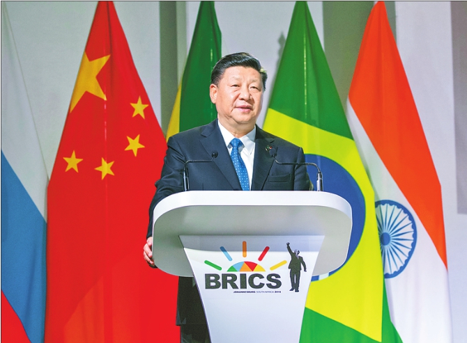 7月25日,国家主席习近平应邀出席在南非约翰内斯堡举行的金砖国家工商论坛,并发表题为《顺应时代潮流实现共同发展》的重要讲话。新华社记者王晔摄