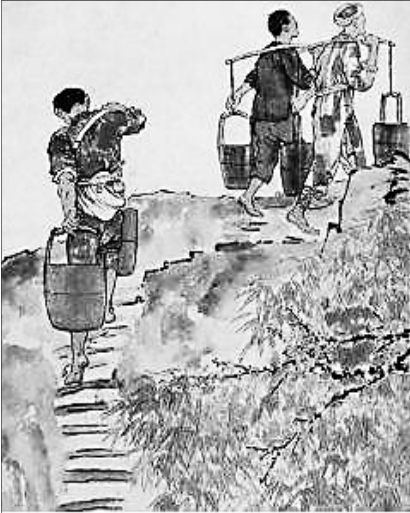 □孙戈 岁月流逝,早年许多生活中的场景都一去不复返了。比如小时候的小县城,没有自来水,有水井的家庭也不多。无论春夏秋冬,都要去附近的水房挑水。 所以,每条街道都有水房,都有排队挑水的人们。房子里有口井,最早是辘轳把井,后来是压水井。各式各样的水桶在水房外排成一行,轮到谁,就进里面打水。辘轳把井时,要拎桶进去,摇上来的水倒进自家的桶里,再拎到外面,挂上扁担挑走。压水井就方便一些,薄铁皮做成的水管,从里面伸出来,把水桶放到下面接水就成。挑水的人大都认识,拄着扁担唠唠闲嗑。前面的人挑水走了,就把地上的水桶依次往前移动,自动自觉地排队。 其他季节还好。冬天挑水,水房外滴水成冰,一跐一滑的,需要格外小心。人们迈着小碎步,张开双臂,保持平衡,把满满的水桶拎远一点儿,再勾上扁担,上肩挑走。而且要时时注意脚下,如果滑倒,溅一身水不说,还可能受伤。街上总有穿着厚厚衣裤的人笨重地挑水,不仅是力气活儿,还有“技术含量”。 挑水是要交费的,一担水,一分钱。 家里人口多的,用手推车推,一车六桶八桶的。每个水桶里都有一块木板,浮在水面上,为的是减少水的溢出。那时候的路不平,坑坑洼洼的,尽量挑平坦的地方推车,推车是不走直线的。 我很早就挑水,大概是小学五年级,十二岁左右。因为爸爸身体不好,我常跟着妈妈去挑水。一开始她挑,我扶着,似乎这样能减轻一些妈妈的负担。再后来就是我挑,妈妈叮嘱我一次挑半桶,挑两次就够了。几百米的路,中途要歇几次。倒进家里的水缸时,个子不够高,常常和妈妈一起倒,擦一把脑门上的汗,挺有成就感的。大概是怕我累,家里用水都很节省。 那时候许多家都是孩子挑水,但都比我大,比我高,比我有力气。遇到邻居家的大人、小伙伴,常常逗我:挑水压肩膀,人长不高,长不过扁担的。 我半信半疑。偷偷拿过扁担,和自己的身高比量,生怕自己会比扁担矮。但我还是慢慢增加了水桶里的水,挑满桶的水了。而且中途也不用歇了。 我挑了好多年水,一直到考上大学。后来条件好了,家里安装了自来水,不用再去外面挑水了。街上也少了挑水的人,但似乎少了一些生活的气息和情趣。街坊四邻少了唠嗑的场所,孩子们也少了痛痛快快解渴的地方。那时候井里的水好喝,有点儿甜!玩得满头大汗的孩子们,跑到井边压出水就喝,恨不得喝饱,不会拉肚子。 而我,个头儿也不算矮。考大学体检时,测量的身高是1.76米,我挺骄傲的。倒是有些逗我的小伙伴从来没挑过水,很多都没有我高。 但我有时候还会悻悻地想:假如我没挑水,会不会长得更高一点儿呢? 早年乡下挑水吃。