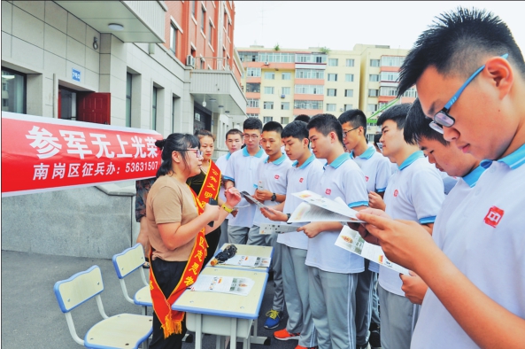 近日,南岗区七政街道武装部在中实学校开展了一场与适龄青年点对点、面对面的征兵宣传动员活动。在咨询台前,七政街道办事处的志愿者向应征青年分发了参军入伍宣传册,为适龄青年宣讲大学生应征参军相关优惠政策。 吴迎本报记者邢汉夫摄