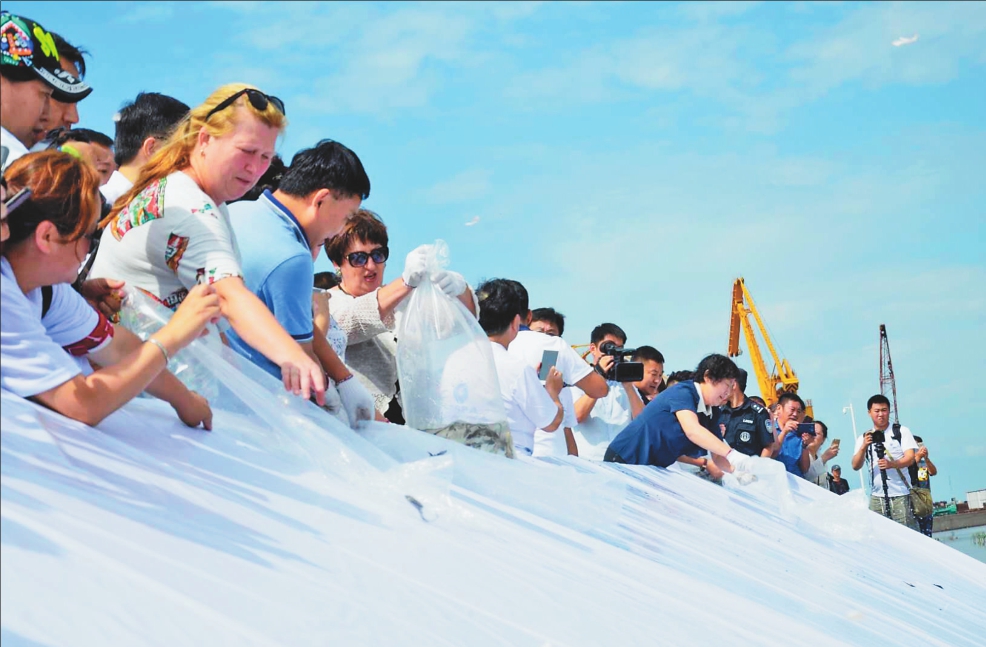 8月8日上午,2018年中俄边境水域黑龙江鲟科鱼类增殖放流活动在黑龙江抚远段水域举行,20.88万尾鲟鳇鱼苗放归黑龙江。黑龙江永续自然资源保护公益基金会、大马哈鱼保护协会、抚远鲟鳇鱼保护协会企业家代表和来自俄罗斯的环保工作者参加放流节活动。 据了解,自2003年开始,抚远已经连续15年向黑龙江流域放流鲟鳇鱼苗,累计放流鲟鳇鱼幼苗3200万尾。公众保护渔业资源与环境的意识不断增强。 张鑫摄