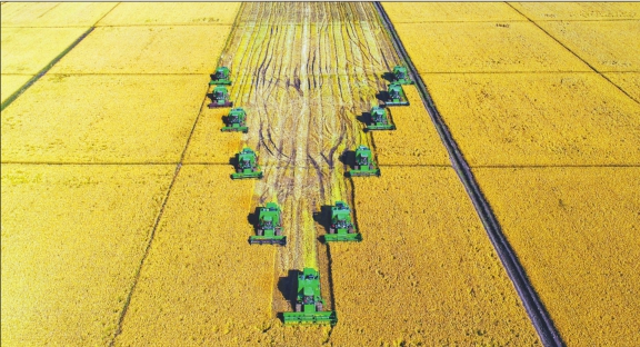 23日,大兴农场的大型机械在进行水稻拾禾作业。赵祥李双双摄