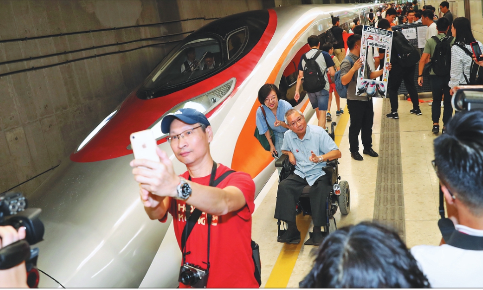9月23日,乘客在香港西九龙站发往深圳的列车前拍照留念。当日7时,G5736次高铁列车从香港西九龙站发往深圳北站;6时44分,G5711次高铁列车从深圳北站开往香港西九龙站,广深港高铁全线开通运营。 新华社记者李钢摄