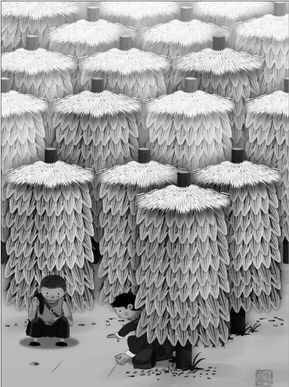 □张林 烧青苞米,在我看来,选穗很关键。要挑选老嫩适中的苞米。太嫩的,烧好后搓不下来粒子,没嚼头儿;太老熟的,咬不动,也不香 苞米是东北最主要的粮食作物,东北人也都爱吃烧青苞米,因为青苞米用火烧熟了吃才是最香的。我们东北人把这种吃法叫做“烧青苞米”。小的时候,烧青苞米吃,那可是能解馋又难得的美食。 生产队分解前,能吃到一穗烧青苞米,真不是一件容易之事。生产队种的大片苞米没人敢动,有看青的手拿“扎枪”在地头来回巡视,可认真了,就是那些看青的也从不去掰集体的青苞米烧着吃。普通老百姓更是不敢掰,一旦让看青的抓到那可就惨了,他会毫不留情地把你带到生产队的队长那,铁面无私的队长要把你偷来的青苞米穗子挂在你的脖颈上满屯子“游街”,晚上还要组织社员召开批斗大会,给你扣上“挖社会主义墙角”的大帽子。 记得在父亲当生产队队长那年,母亲为给我们四个“小饿狼”解馋,趁看青的回家吃饭换岗的空挡儿,母亲跑到生产队地里掰回几穗青苞米给我们烧着吃。父亲知道后,同母亲好一顿吵之后,他居然把水缸往灶坑门一堵,不让母亲做饭。当时,我们哥几个远远地望着面沉似水的父亲,大气都不敢出。 后来家里房前有了个菜园子,母亲便在园子里面紧靠栅栏边儿种上了一圈苞米,而这些苞米也就成了我们小时候最幸福的零食了。园子里种上苞米的那天起,苞米便在我幼小的心中开始拔节,直到有一天青青的苞米秸秆在我眼前蹿缨,没几天甩出了大棒子,那飘香的烧苞米也就属于我了。园子里积温较高,园子里的苞米一般要比大田里的苞米灌浆早,也最能首先满足一家人吃到新鲜烧苞米的愿望。 母亲最会烧青苞米,因为母亲最有耐心。那时的东北农家都烧大灶,灶台上一口大锅,下面烧柴。饭后,灶膛的炭火通红。母亲去掉苞米叶子,把炉钩子的钩用锤子砸直,从苞米棒的根部扎进去,然后放灶膛的火炭上面烤烧。为使苞米烧烤均匀,母亲还慢慢地转动手柄,这样只一会儿工夫,青苞米便会噼里啪啦响起来,熟苞米诱人的清香也就钻进了我们几个馋猫的鼻孔。苞米烧好以后,母亲用苞米叶子包在烫手的苞米穗上,拔掉铁条,把喷喷香的熟苞米穗掰成两三节扔到我们的近前,我们会立马抓过来一节美美地享用。如果用双手将烧熟的苞米粒搓下来吃,吃完后满手满嘴唇都是黑黑的。 母亲常常跟我们说,心急吃不了烧青苞米。母亲的话千真万确。性子急,烧烤不得法,会将好端端的青苞米烧得焦糊如炭,就没有什么清香味美可言了。吃烧青苞米,要有火中取“粟”不怕烫的本事,因为烧熟的青苞米一旦放上一会儿,凉了,也就失去烧青苞米吃的那个诱人的清香味了。那时的我经常是被滚热的苞米穗烫得抓耳挠腮,为让熟苞米粒尽快入口下肚,将其高抛倒手吹气降温,有时双手捧着苞米穗呲着大门牙猛啃,这种发憨的吃相现在想来有点像吹口琴的样子。母亲的吃相可比我文雅,她用双手将烧熟的苞米粒一点点搓下来,一点点扔进嘴里慢慢咀嚼。当然,园子里种的苞米有限,也吃不上几次烧青苞米,不能真正从心里解馋。 后来,家家都有了自己责任田,也都种上了旱涝保收的大苞米。吃烧青苞米也就成了很平常的事。通常是在苞米将要成熟之时,我和家人,或是干脆再叫上几位要好的乡邻,去野外烧青苞米。野外烧青苞米,可比在家的灶膛烧香多了,一色用干树枝的炭火烤,一点也不焦糊。在野外,我们掰定浆的苞米,随便哪一家的都行,让主人看见了也不碍事,尝尝鲜不会影响什么年成。我们四处找来干树枝子,点着后等到不冒烟了(蹿烟的烧苞米没个吃),便把扒好的青苞米放在红红的炭火上,拿苞米叶子一旁扇着风烧;也有从家里拿来铁钎子的,把铁钎子穿进苞米的根部,手擎苞米钎子,慢慢地反复烘烤,苞米粒的表层泛起了金黄,等到清香溢出来后,搓下喷香苞米粒儿,几个粒几个粒地往嘴里扔,那怡然的神态,煞是醉人。 烧青苞米,在我看来,选穗很关键。要挑选老嫩适中的苞米。太嫩的,烧好后搓不下来粒子,没嚼头儿;太老熟的,咬不动,也不香。值得一提的是:在小品里,有一句台词说“秋苞米吃起来更香”。这个秋苞米,指的是秋收时苞米成熟收割了,有少许还比较嫩,可以用来烀或烧着吃,来当青苞米吃。其实秋苞米烧吃更香,我的经验是:不是放在火上燎,而是埋在灶膛带火的灰里烧。这样烧出的秋苞米,最香脆,最有嚼头,最让人回味无穷。 丰收的玉米。