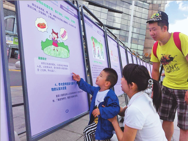 平衡膳食健康生活科普知识展览在活动现场展出,吸引了现场群众的目光。本报记者朱彤摄