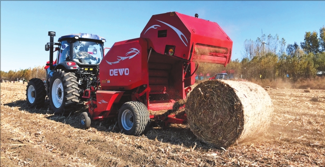 双鸭山市宝山区七星镇的玉米地里,机车正在进行快速打捆作业。