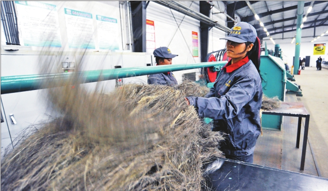 天木公司云天麻业汉麻皮秆分离车间。 本报记者王振良摄